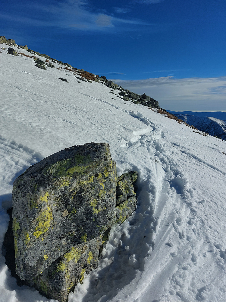 Stopa vyleštená a pevná, ale nešmýkalo sa ani v strmších pasážach – pekne to lepilo. Pásy samozrejme mokré durch, už po pár metroch a čím vyššie, tým aj teplota vzduchu vyššia. Miesta aj snehu našťastie dosť aj pomimo zjazdovky. Aj čistý bol, len buriny z neho trčali ako dôkaz jeho nedostatku.