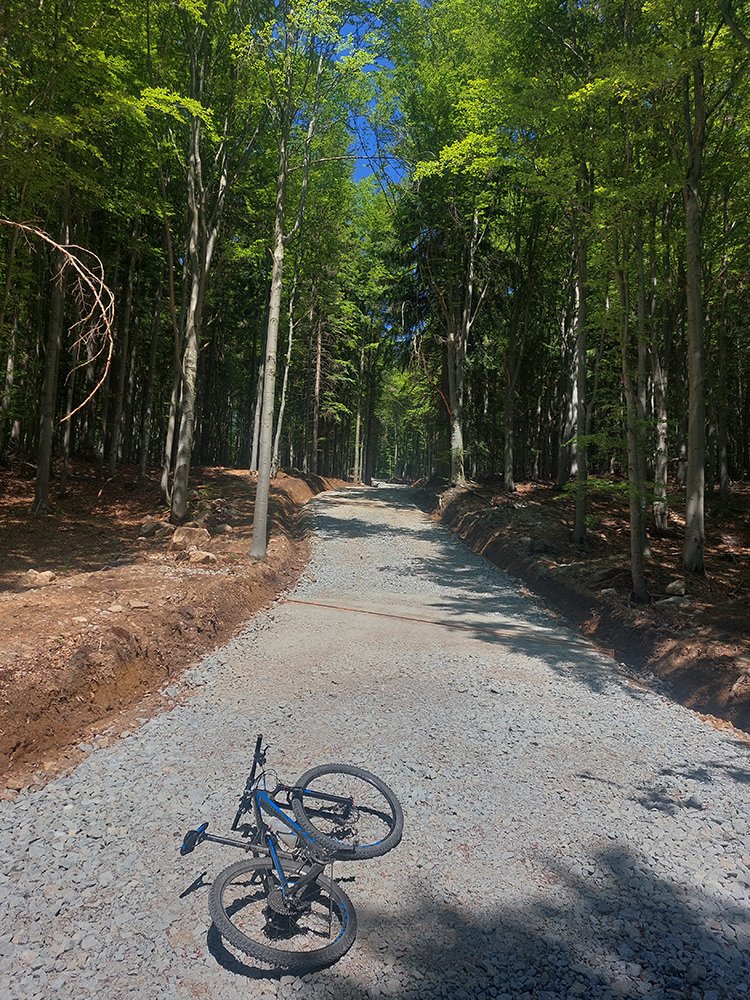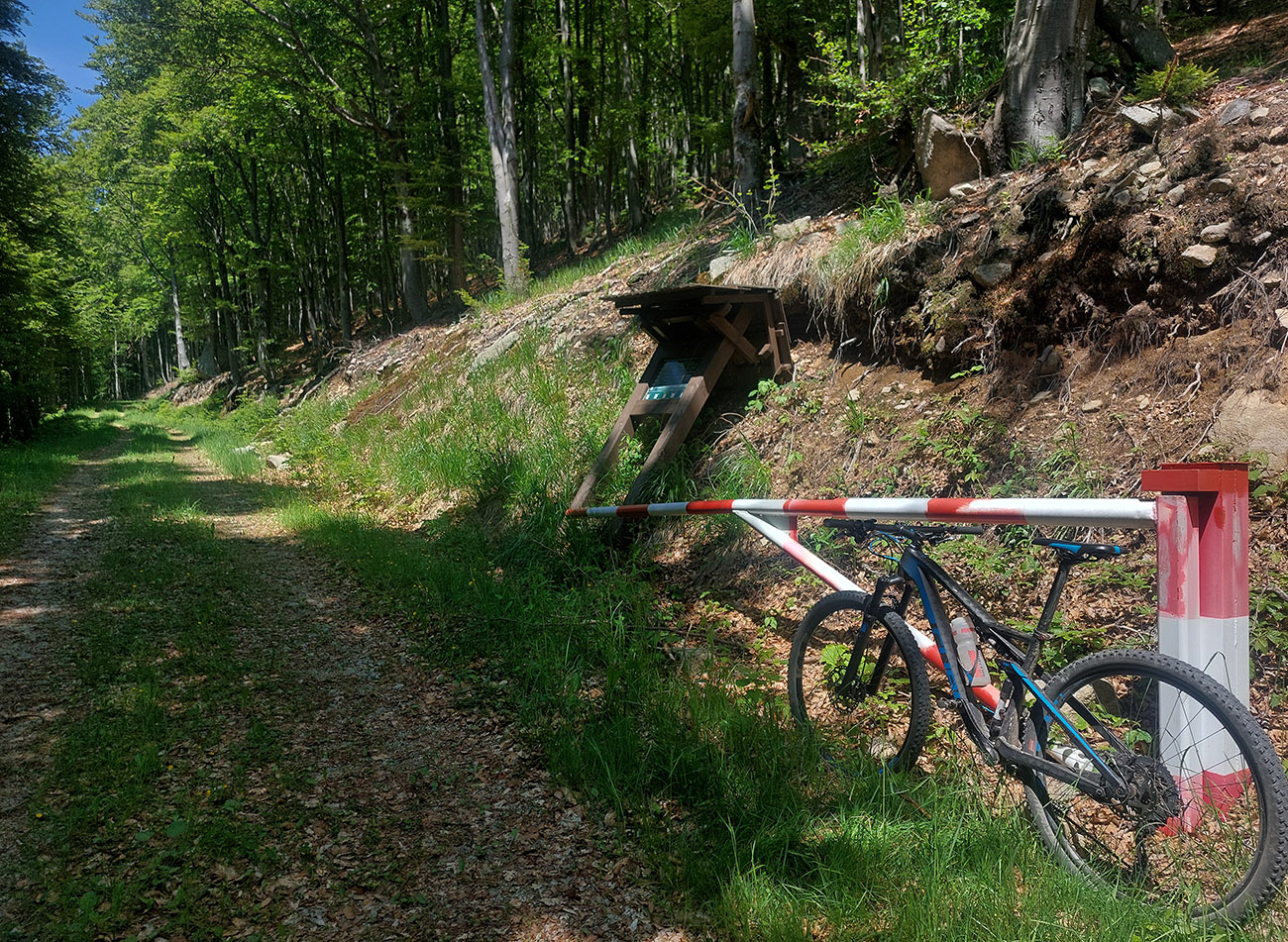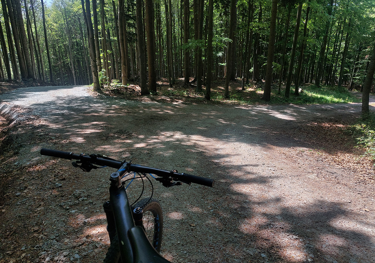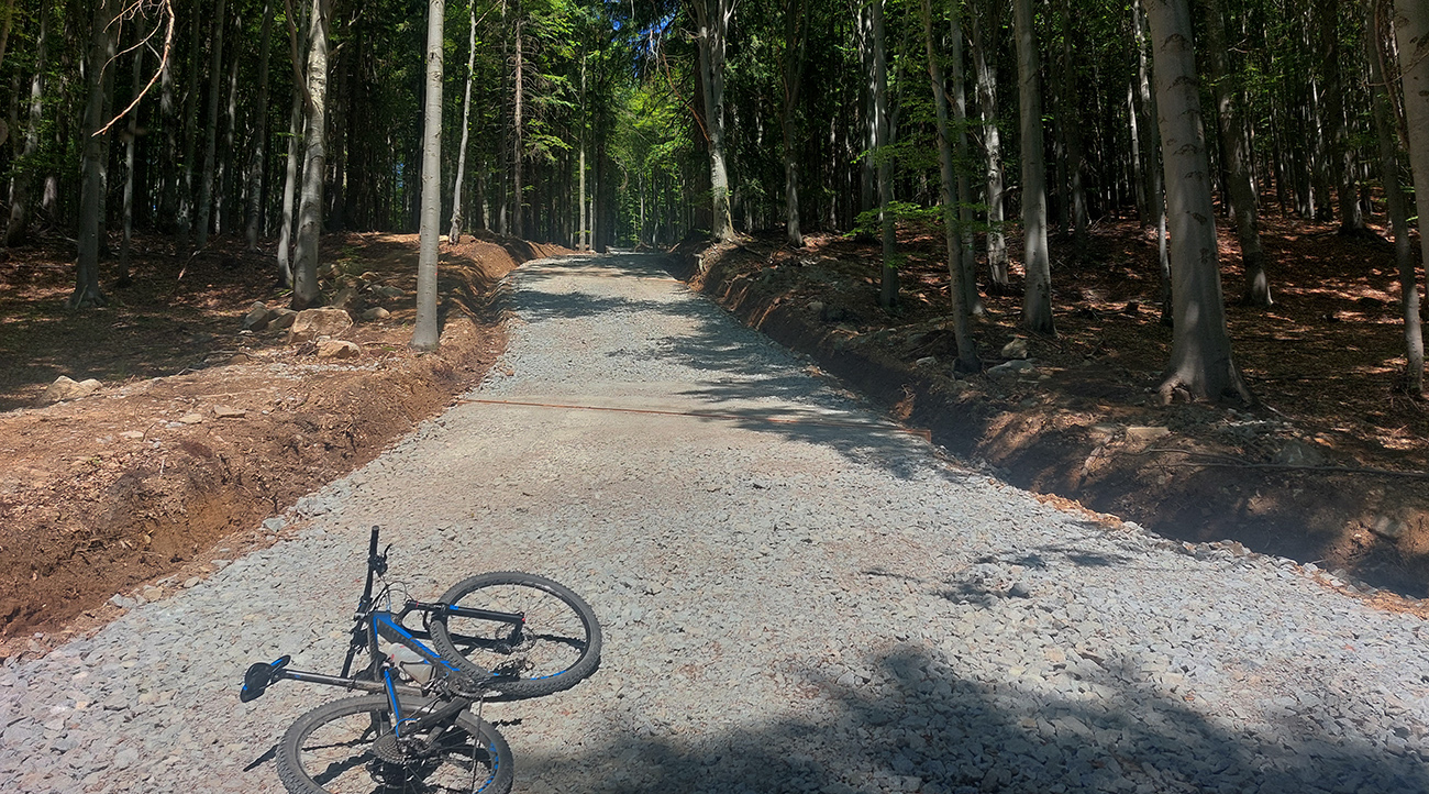 Návrat na makadam, aj popri odpočívajúcich bagroch, a nasledovalo strmé finále so zaradeným „vyprošťovákom“, až na križovatku na Ploštine. 1130 m. n. m. – to len aby bolo jasné, ako vysoko sa až nová cesta štverá. Ešte jedna krátka zachádzka po pohodlnejšej ceste v smere jazdy, otočka a dlhýýýýý zjazd.