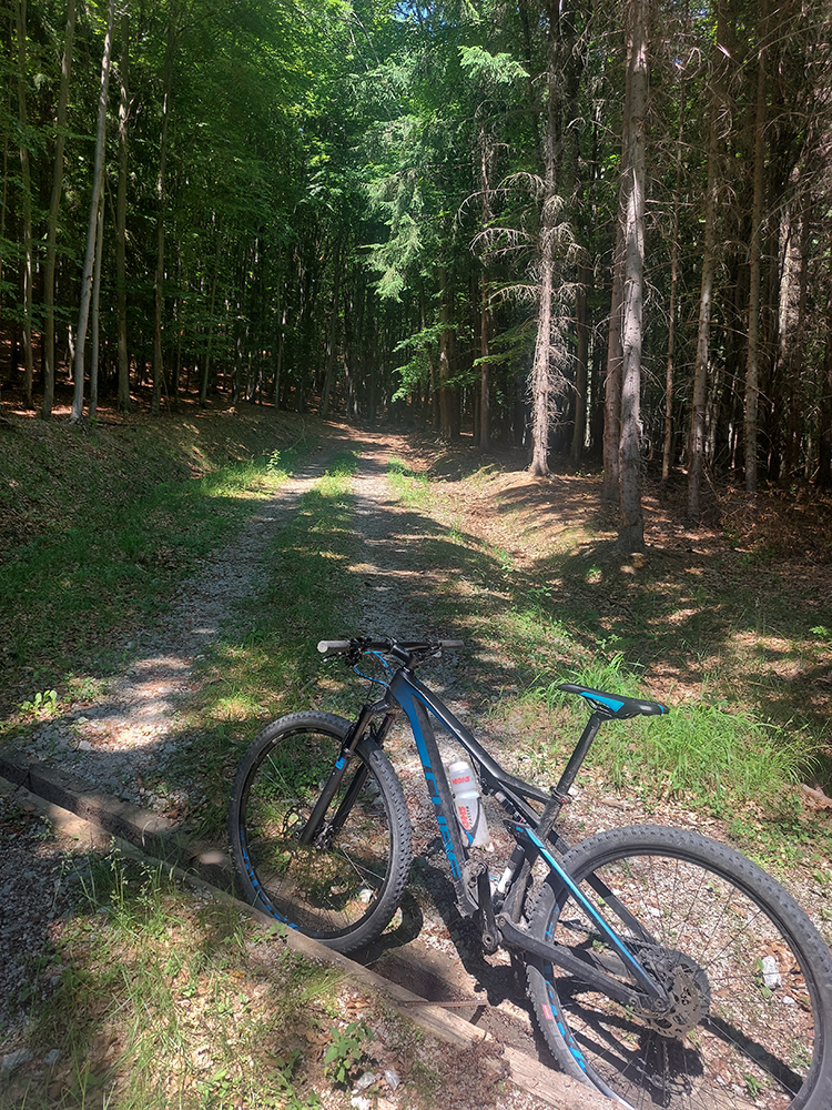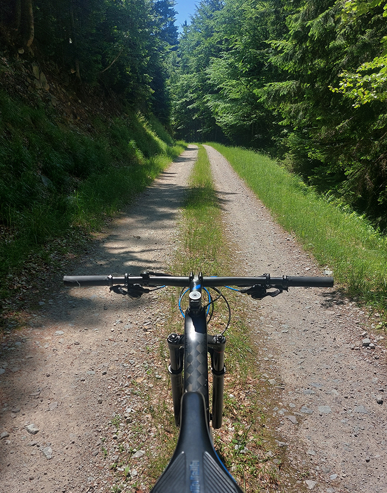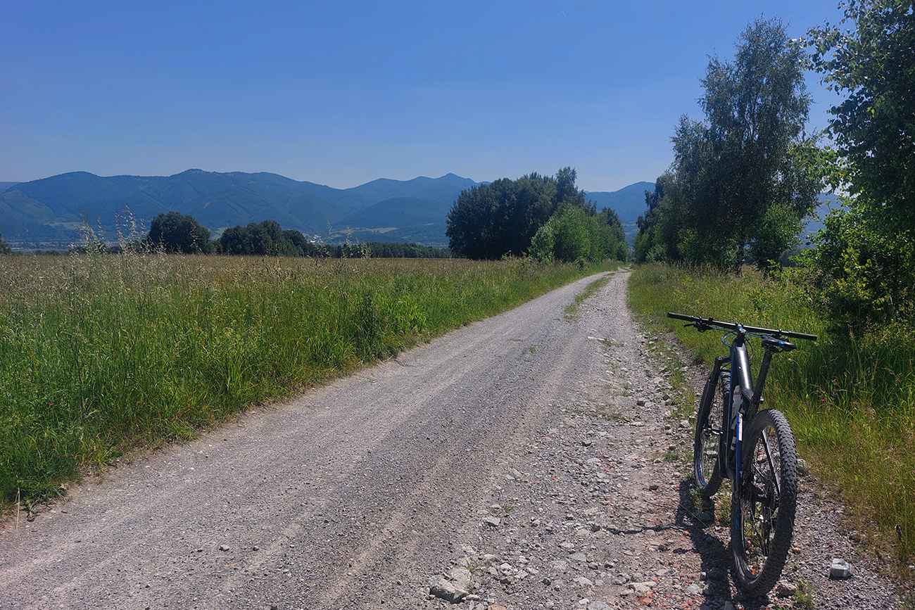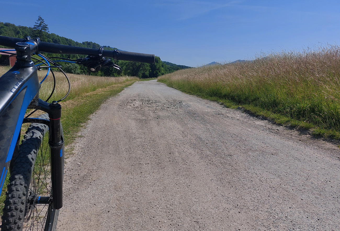 Návrat na makadam, aj popri odpočívajúcich bagroch, a nasledovalo strmé finále so zaradeným „vyprošťovákom“, až na križovatku na Ploštine. 1130 m. n. m. – to len aby bolo jasné, ako vysoko sa až nová cesta štverá. Ešte jedna krátka zachádzka po pohodlnejšej ceste v smere jazdy, otočka a dlhýýýýý zjazd.