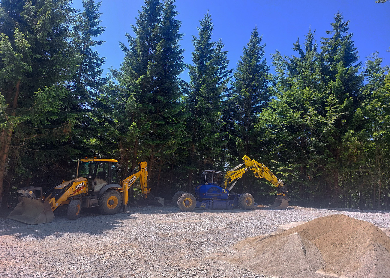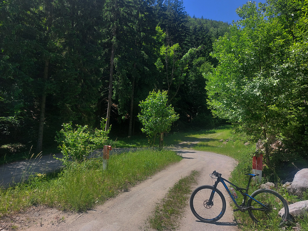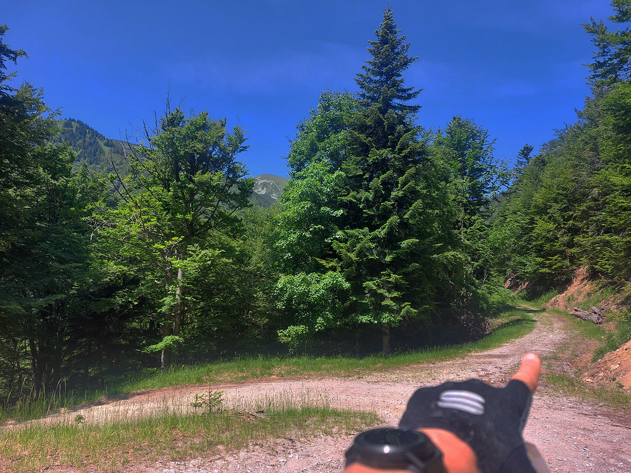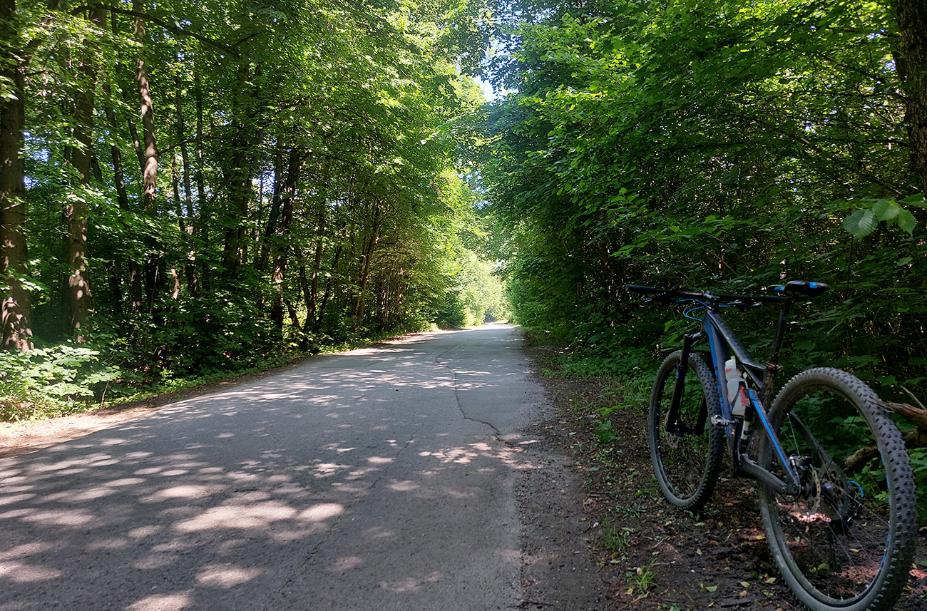 Návrat na makadam, aj popri odpočívajúcich bagroch, a nasledovalo strmé finále so zaradeným „vyprošťovákom“, až na križovatku na Ploštine. 1130 m. n. m. – to len aby bolo jasné, ako vysoko sa až nová cesta štverá. Ešte jedna krátka zachádzka po pohodlnejšej ceste v smere jazdy, otočka a dlhýýýýý zjazd.