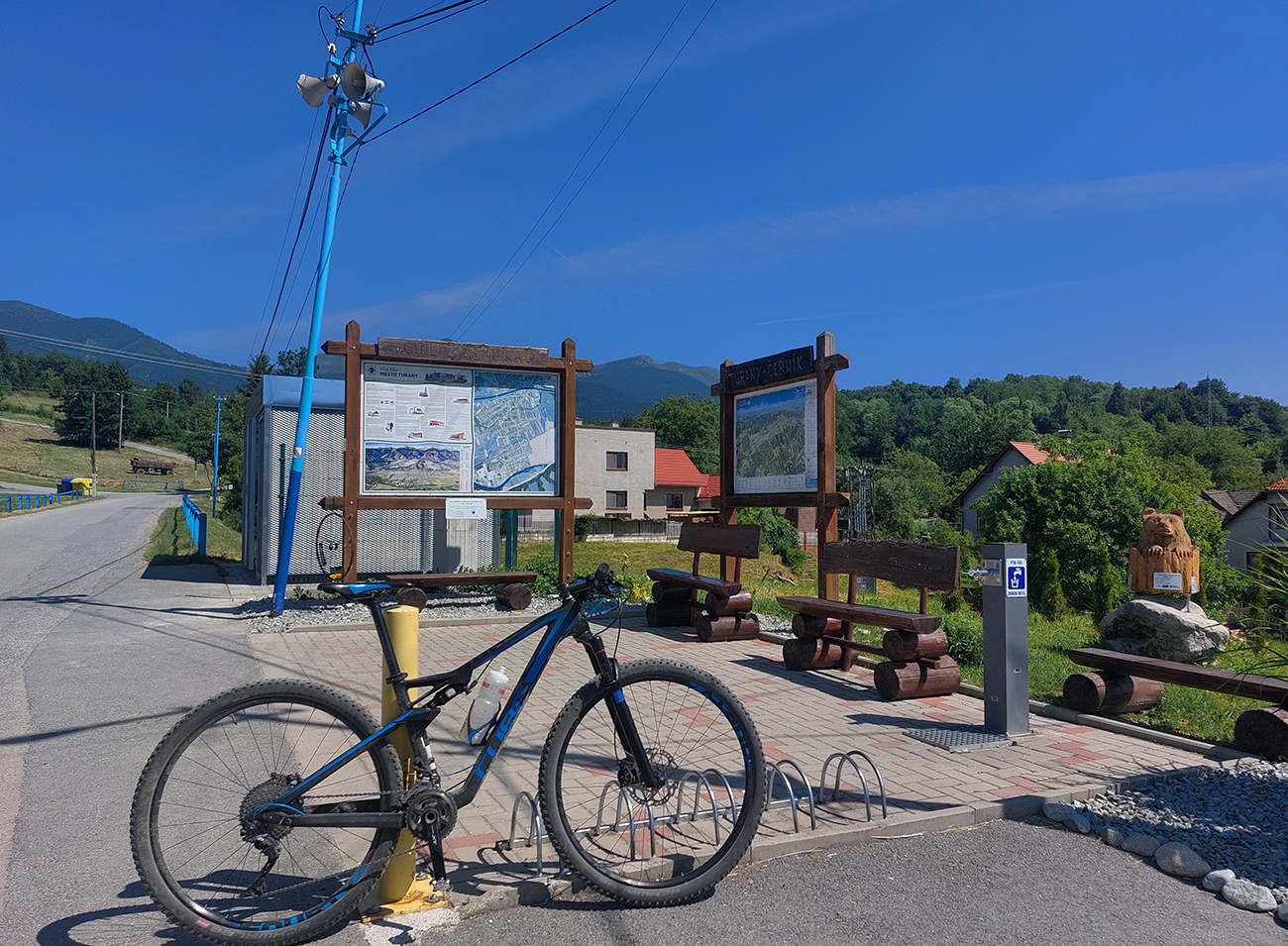 Okrem značky aj staršia tabuľa, oznamujúca predošlú etapu obnovy ciest, tak som vyskúšal aj tam, ale to bolo kratučké. Do susedných svahov pod Malým Kriváňom a smerom na Drgovú, kde stavebný ruch akurát zúri najviac, sa mi už nechcelo. Tak už len dlhý švihot po šotoline pomedzi lúky až dole do Turian, s posledným výhľadom na Kriváne zo serpentíny na konci toho zjazdu. A odjazd domov, kade som prišiel.