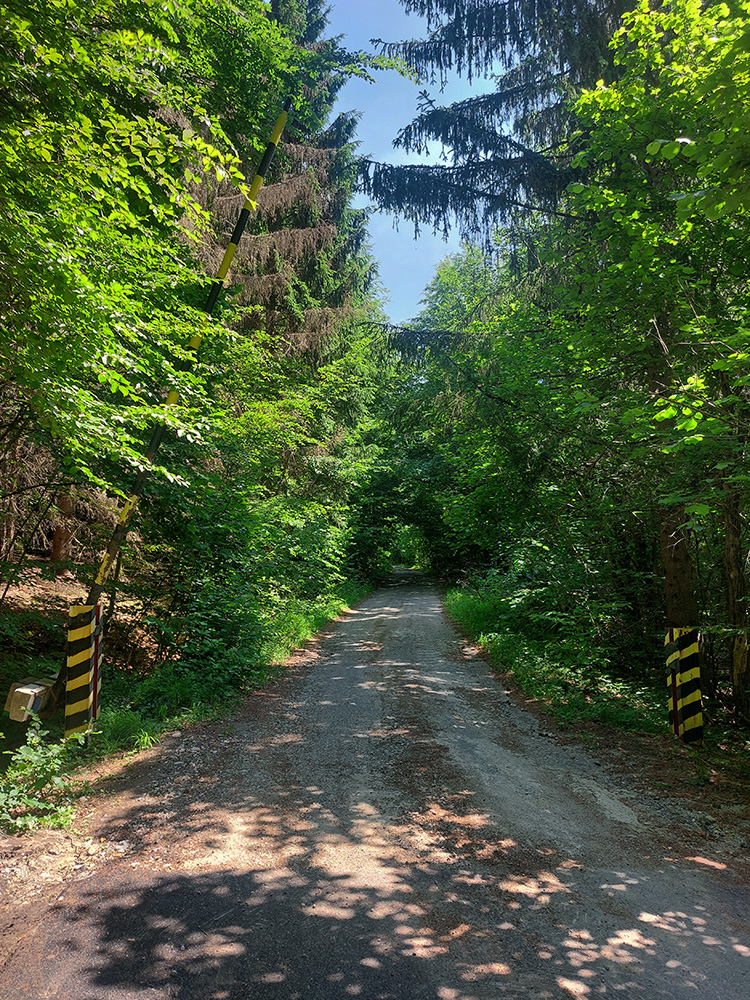 Na Zajacovej doľava a kúsok ponad Snilovský potok. Chotárna hranica vedie jeho korytom, tak tam ešte chvíľu po hline, ale od mostíka – krásny a hladký asfalt! Už pár rokov, tak už zanesený a miestami rozpukaný – žeby nie až taký dobrý pre naložené kamióny? A dreva okolo cesty nachystaného požehnane. V zásade ale pohodlné naberanie výškových metrov: