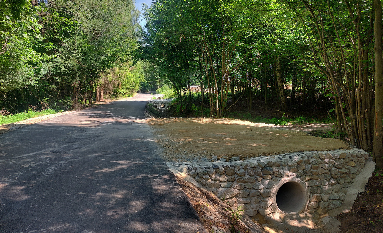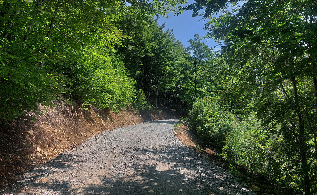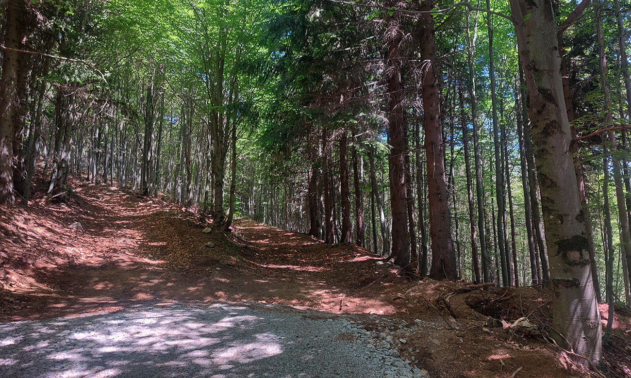 A ozaj: nie, že nový povrch, ale komplet opravená cesta, aj s novými odbočkami k chatám. Samozrejme ako je na Slovensku zvykom, len po rampu na hranici so šútovským chotárom, čiže nejaké dva kiláky. Ďalej po Zajacovú rozbitá klasika. Takto v lese – nebola by lepšia šotolina, keď už? Vo svete to funguje. Inak pozor! Autá tam už aj tak nesmú, len po nové parkoviská dole pri kempe (platené).