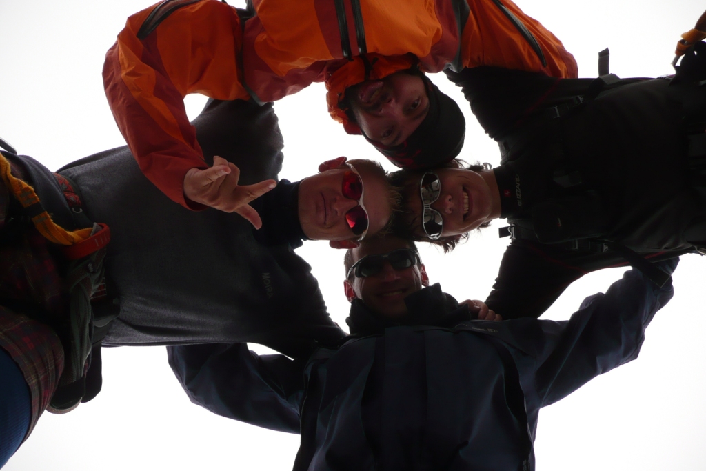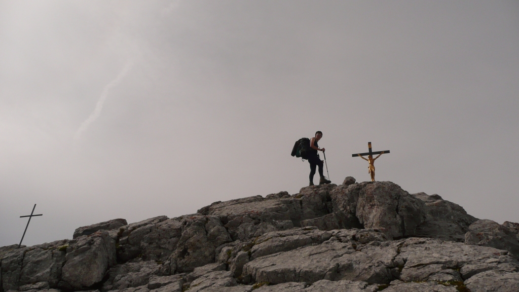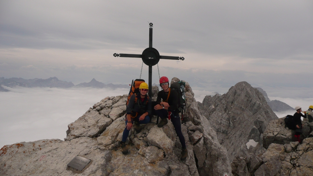 Hrebeň je vďaka zaisteniu úplne v pohode. Najťažšie úseky by sa dali prirovnať k Martinovke. Miestami je expozícia skutočne nádherná. Z doliny sa už hrnú mraky, takže hlbočinu východnej steny pod nohami vôbec nevnímame. Na hrebeni nie je veľa ľudí a tak si dokonale užívame nádhernú hrebeňovku. Udávané časy sťahujeme na polovicu a na posledný Južný vrchol Watzmannu 2712m prichádzame spolu s oblačnosťou. Sme však úplne pokojní, lebo vidíme že oblačnosť nie je búrková a žiadne hromy blesky nehrozia. Nanajvýš zmokneme ako myši. Na Sudspitze sme dobehli aj Roba so Spyrosom, spravili pár stupídnych fotiek a začali zostupovať. Čaká nás vyše 2000m prevýšenia smerom dolu. Vyzerá, že celé to absolvujeme v daždi. Dážď sa postupne mení na lejak. Zostupujeme dolinou Wimbachtall. Dolina skutočne úžasná. Samé strmé zrázy, vodopády a skalné veže. Dážď dodáva doline úžasný dojem divokosti. Škoda len, že pre ten dážď sa nikomu nechce fotiť. Pri chate, ktorej meno si nepamätám, vo výške asi 1200m vravíme, že už sme celkom dosť mokrí a polovica Popradčanov má už zostupu aj celkom dosť, dolu nás nič suché nečaká... Rozhodujeme sa teda prásknuť po kešeni a dáme tých 14ečiek za nocľah v suchu a teple. Doplníme to horúcou čokoládou a pivkom pre lepší spánok a už nám vôbec nič nechýba. Nádherný deň je za nami.