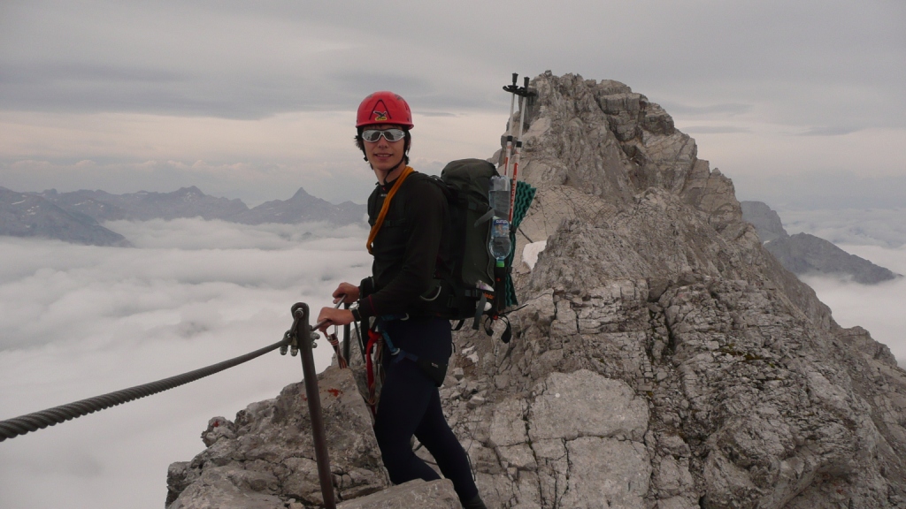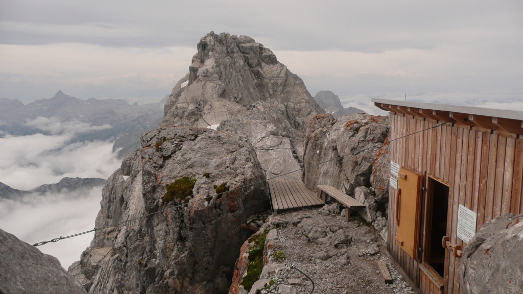 Ráno sme mali vyraziť skoro, ale tak dobre sa spalo, že nikomu sa nechcelo vystrčiť nos zo spacáku. Až niekedy pred siedmou sme sa premohli nahádzali veci do batohov a bez raňajok vyrazili do kopca. Za hodinku sme aj my na Watzmannhaus, ale o popradskej sekcii nasej expedície tu na chate nikto nič nevie. Možno použili nejaké krycie mená, ale pravdepodobnejšie je, že niekto chcel ušetriť na dani, tak ich ubytoval „načierno“. Ale to je jedno. Stúpame na prvý vrchol - Höcheck 2651m. Tu je bivakovacia búda. Začína ferrata. Ešte som nebol na ferrate, takže nemám ani farratový set. Veľmi dobre poslúži aj obyčajná plochá slučka s karabínou. Zatiaľ lámeme rekordy na časoch udávaných na smerovníkoch. Rýchle tempo nám vyhovuje aj preto, že vieme, že poobede sa má pokaziť počasie. Ďalším cieľom je najvyšší bod hrebeňa Watzmannu – Mittelspitze 2713.