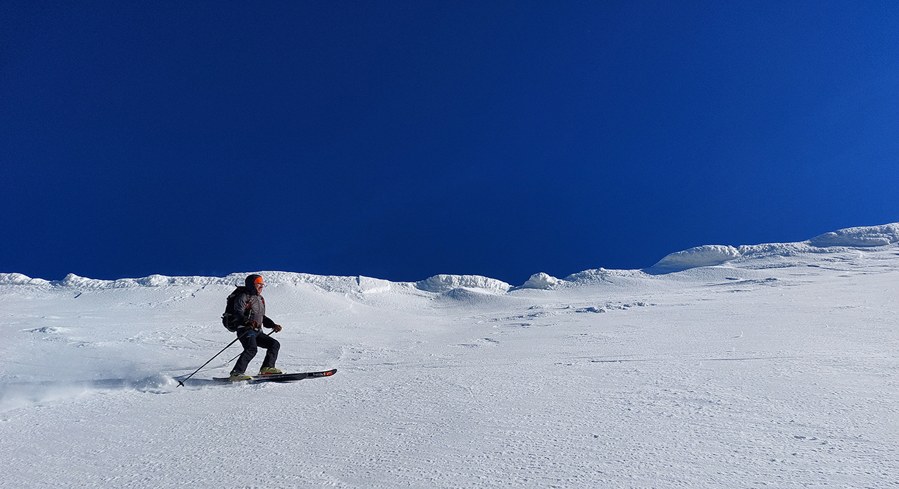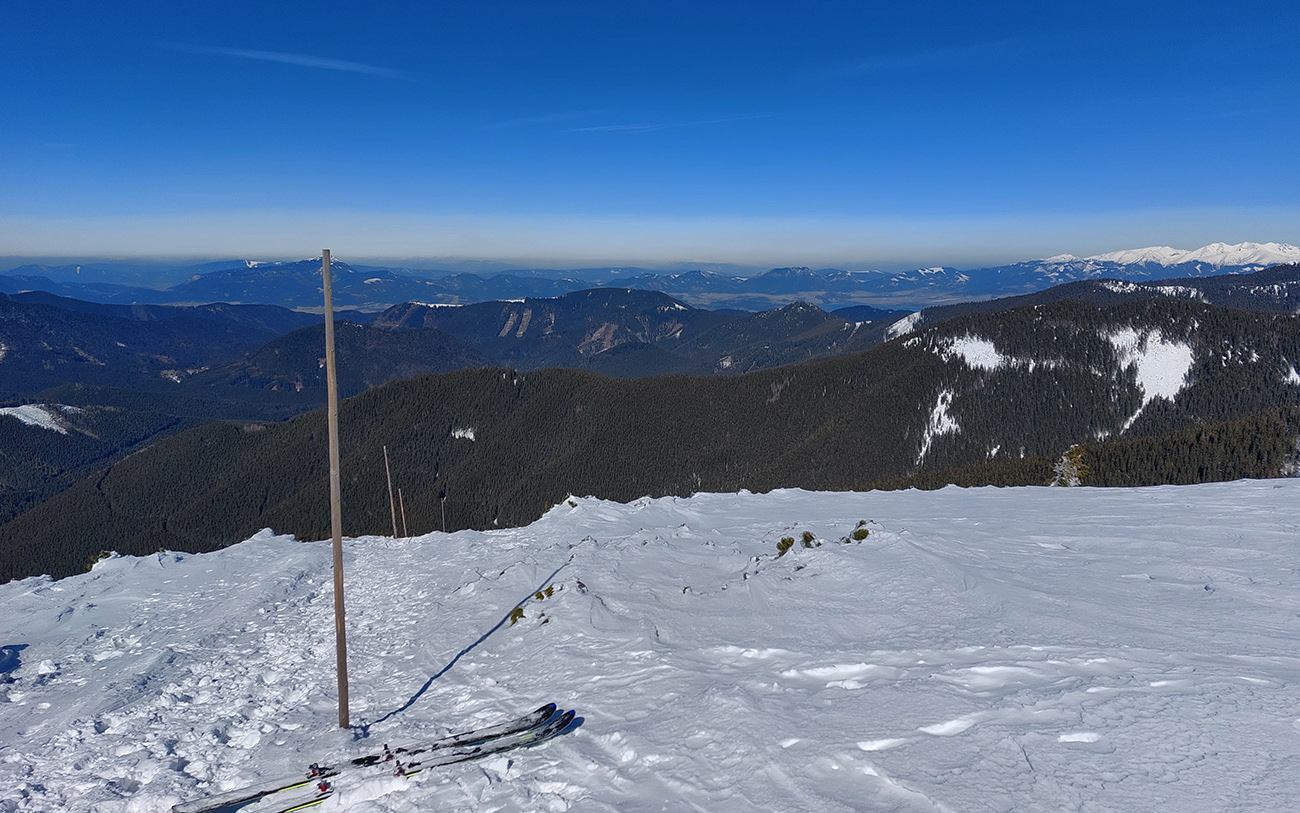 A tam samozrejme dilema, že kade hore. Zhodli sme sa napokon, že to vezmeme zľava a keď sa vyššie rozkukáme, uvidíme čo ďalej. Napokon sme to tam otočili dvakrát. Prvá jazda v parádnom prašane na tvrdom podklade, priamo do severu. Druhá trochu horšia o „zjazdovku“ vedľa, aj nejaké kôrky už za nohy ťahali, orientácia svahov už hrala podstatnú rolu. Ale slniečko sme videli po dlhej dobe konečne inak ako len cez okno pracovne, to bolo hlavné. A teplota ideál, aj vietor len osviežoval, nemrazil.