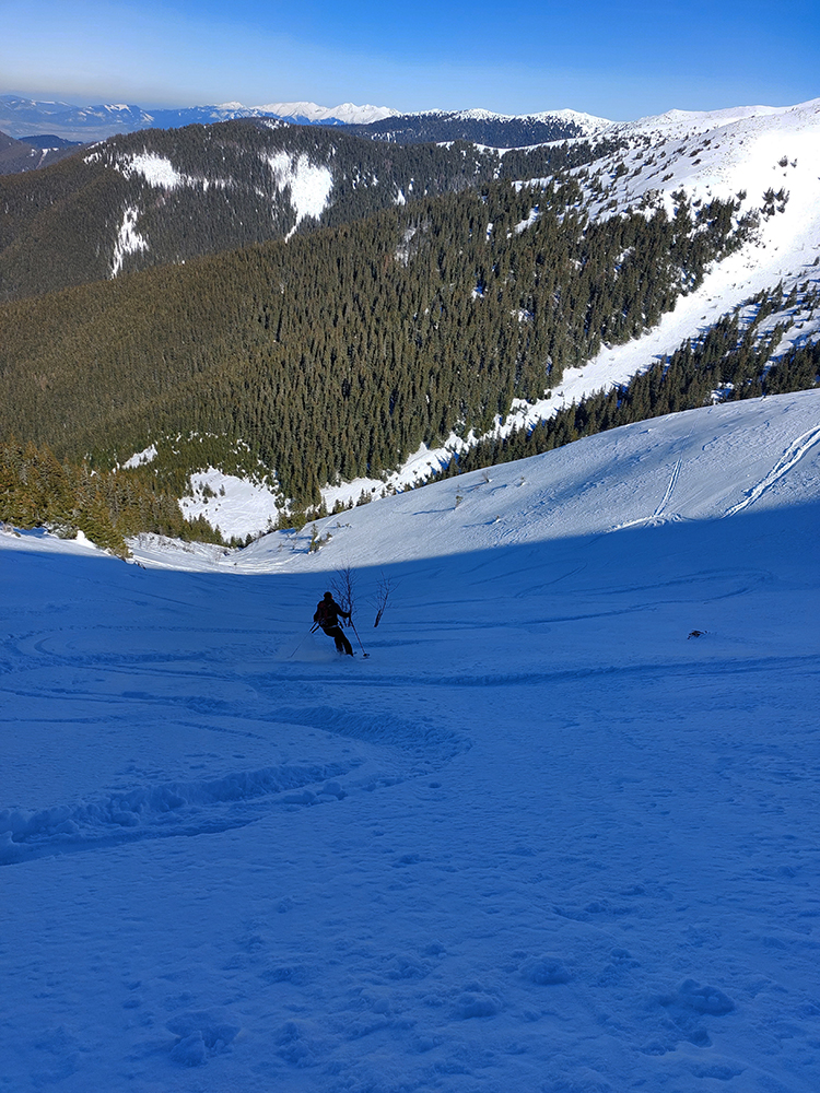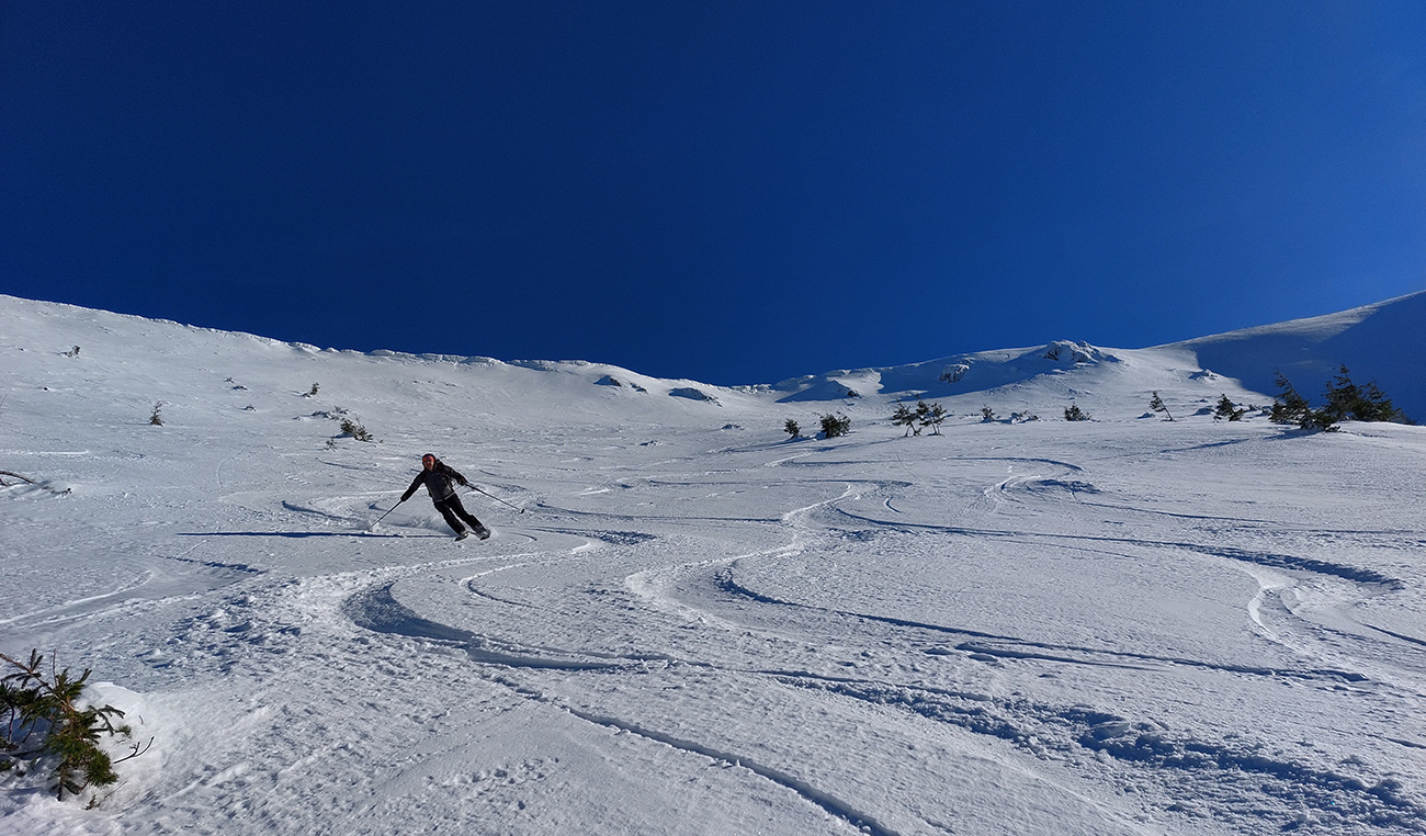 A to najlepšie na koniec. Na úvod konca síce skok cez ľadový prevej na drsný betón (úplne na vršok Latiborskej sme ani nešli), no ten sa po pár oblúkoch zmenil na parádny, konzistentný sneh, prechádzajúci až do takmer neuveriteľného, jemného, premrznutého prášku. A pretože tadeto veľa ľudí neprešlo, našli sme si aj my to svoje, nepočmárané. No rozkoš jednoducho neočakávaná!