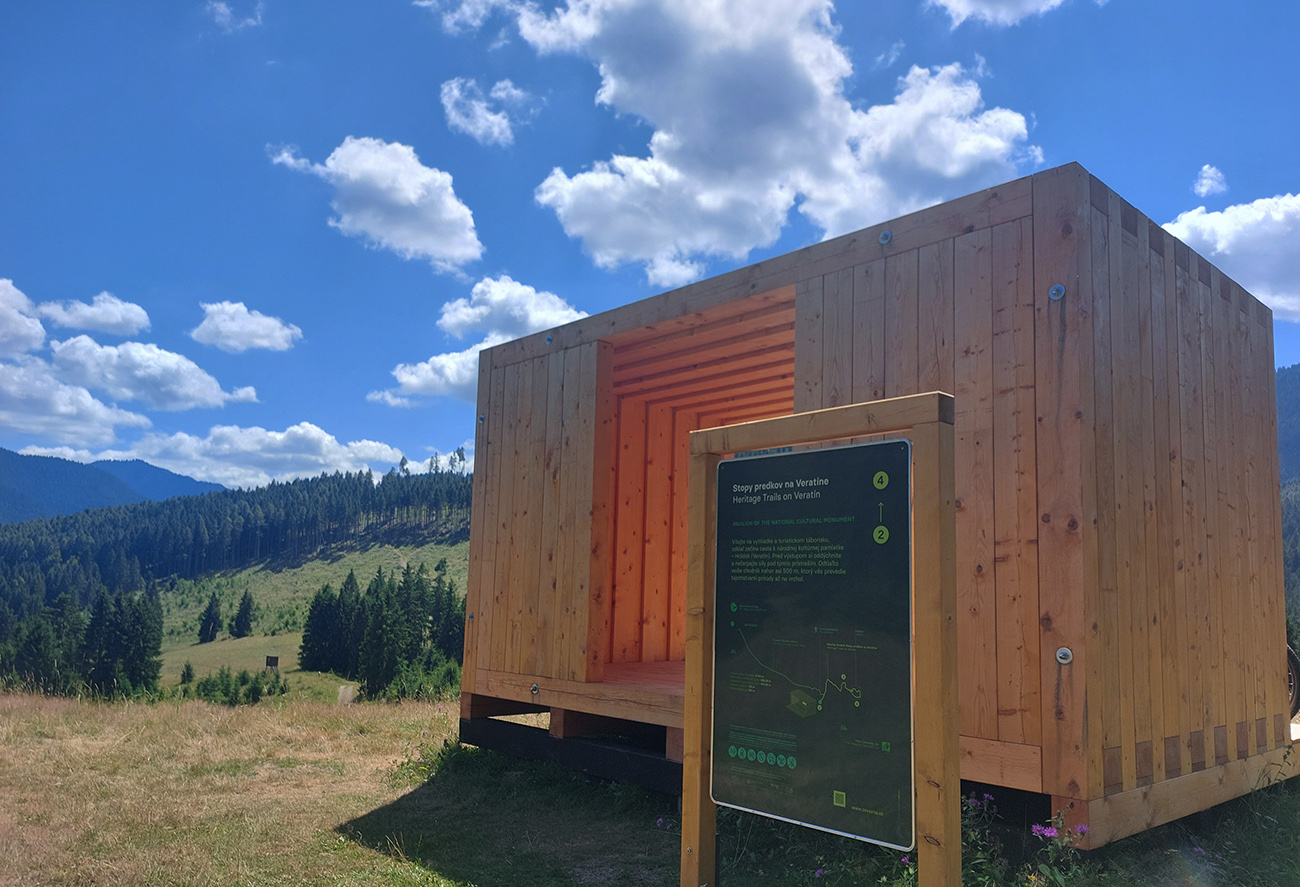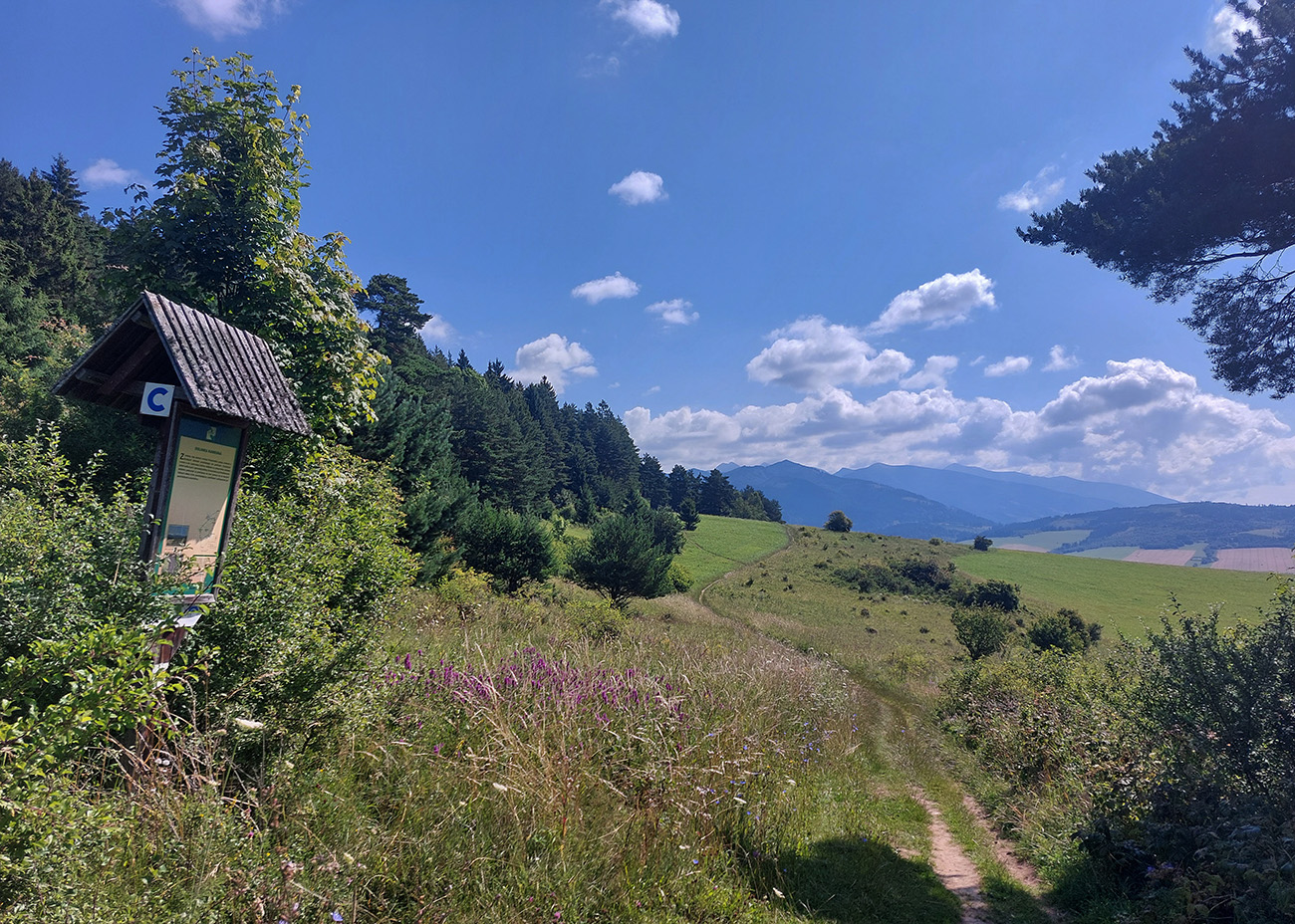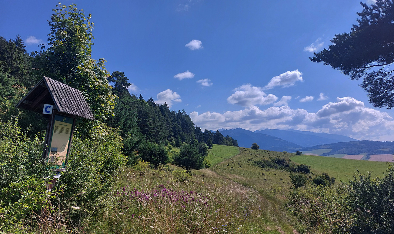 Medzi ústím Dúbravskej a Ľupčianskej doliny, ponad Kľačany, pod kolesami dominuje hlina a tráva, výhľady doprava ostávajú, cesta vedie viac z kopca, len s malými brdkami na spestrenie. Na konci parádne oddychovisko, presne pre cykloturistov - využil som na posedenie a pojedenie. Už som vedel, že časovú rezervu ku vlaku mám.