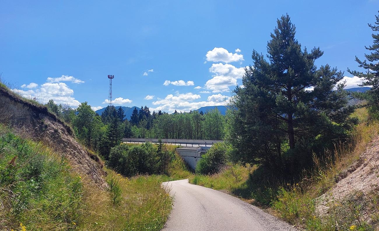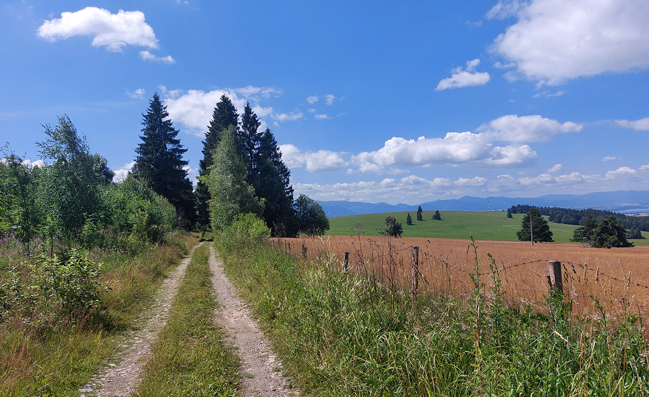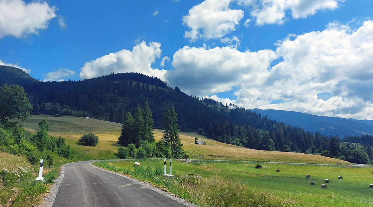 Matiašovce – len skok cez hlavnú a začína jedno z najdlhších stúpaní na trase. Ale plynulé, v tieni a po klasickej, starej, asfaltovo-šotolinovej ceste. Za rázcestím Noviny však šok – nový asfalt, široký na dva kamióny. S prestávkami v podstate až na Bobroveckú vápenicu. Krajina lúk a solitérnych stromov okolo cesty ale pekná, nad hlavou dominujú Babky - presunul som sa pod Západné Tatry.