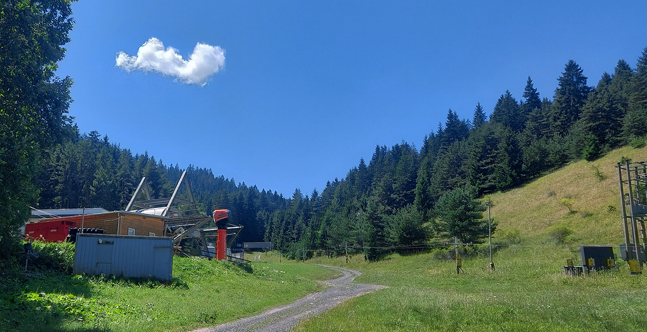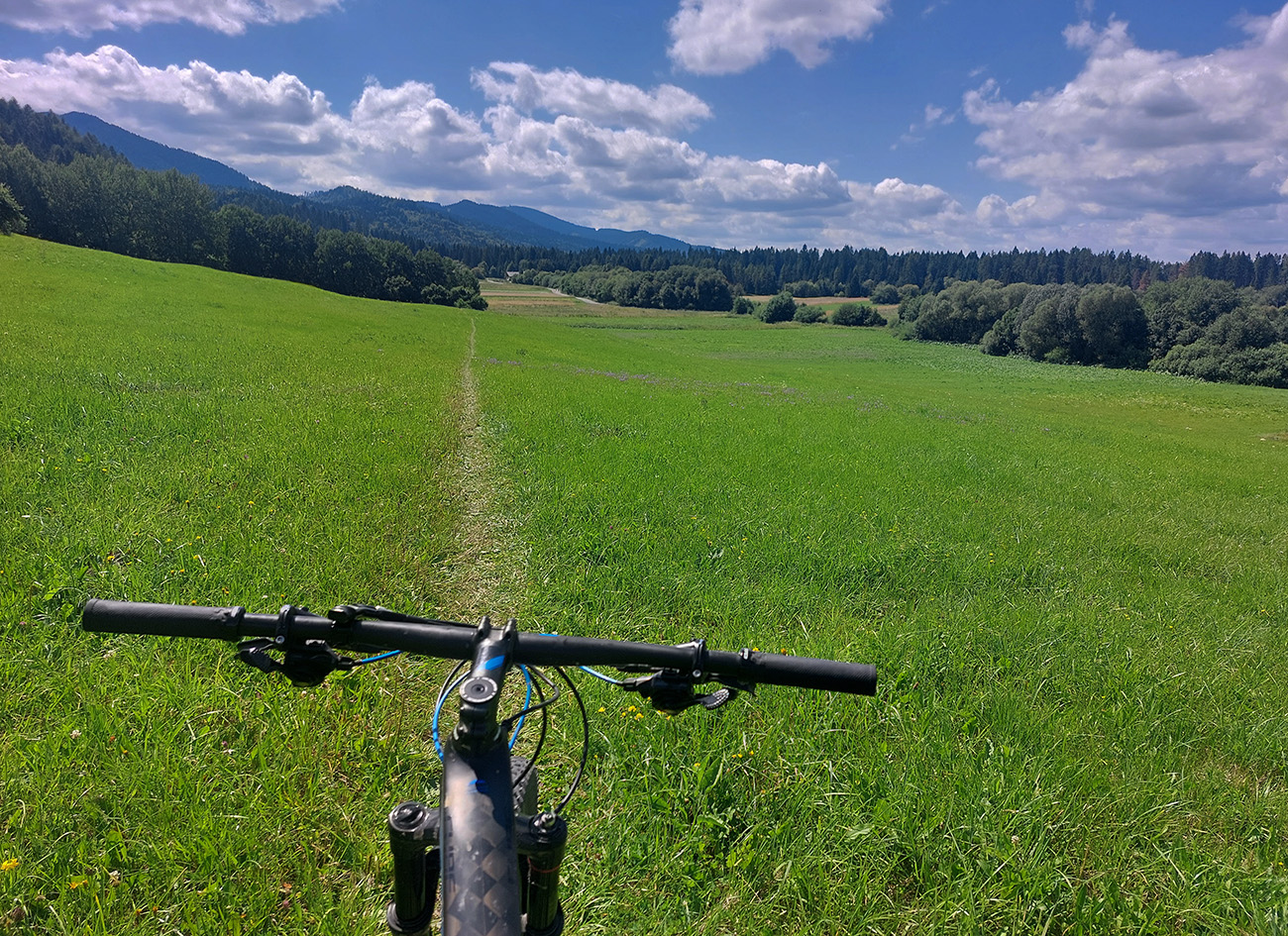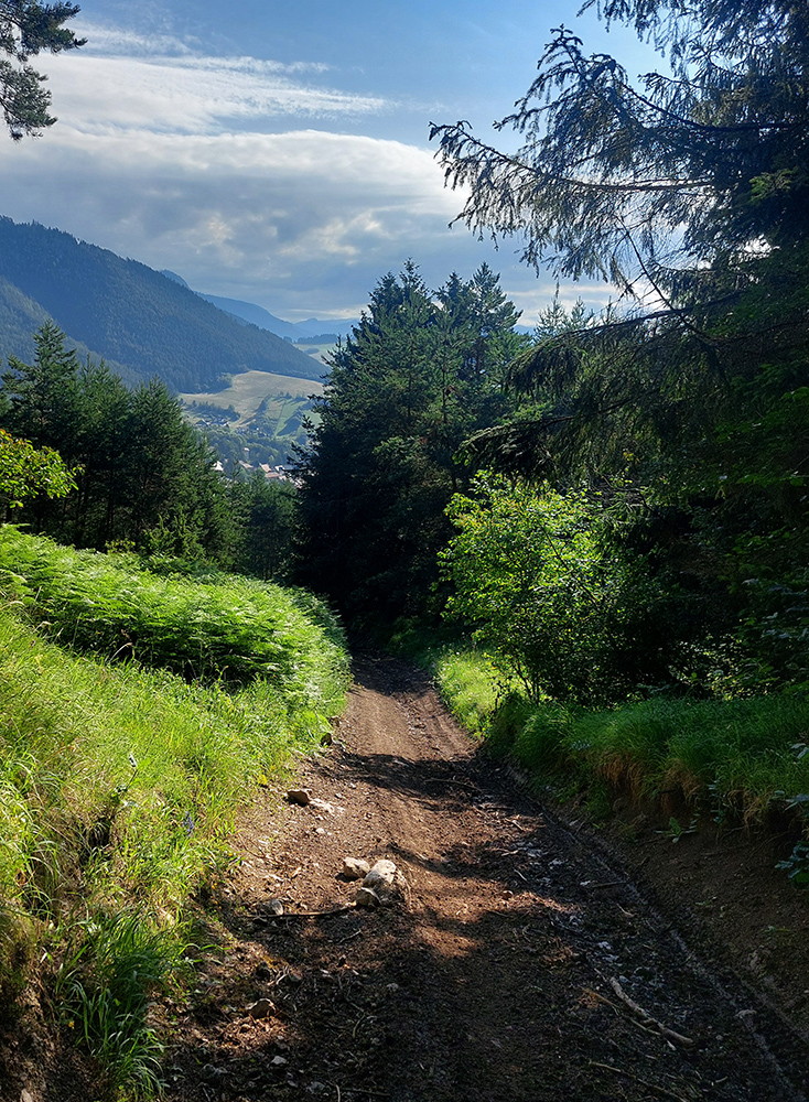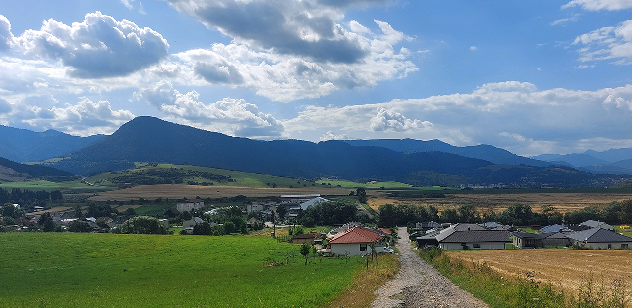 V okolí ústia Demänovskej doliny kopec gýčových dreveníc, vypipľaných chát a atrakcií pre turistov, pod kolesami sa strieda asfalt, šotolina aj tráva, len zľava stále les a doprava výhľady k Mikulášu cez guľaté pahorky podhoria. Plošín, Pavčina Lehota. Lazisko som obišiel ponad domy, cez lúku parádne vyjazdená stopa od bicyklov. Zámer zájsť si aj k najväčšiemu drevenému kostolu u nás síce bol, ale už som tam bol, nechcelo sa mi už.