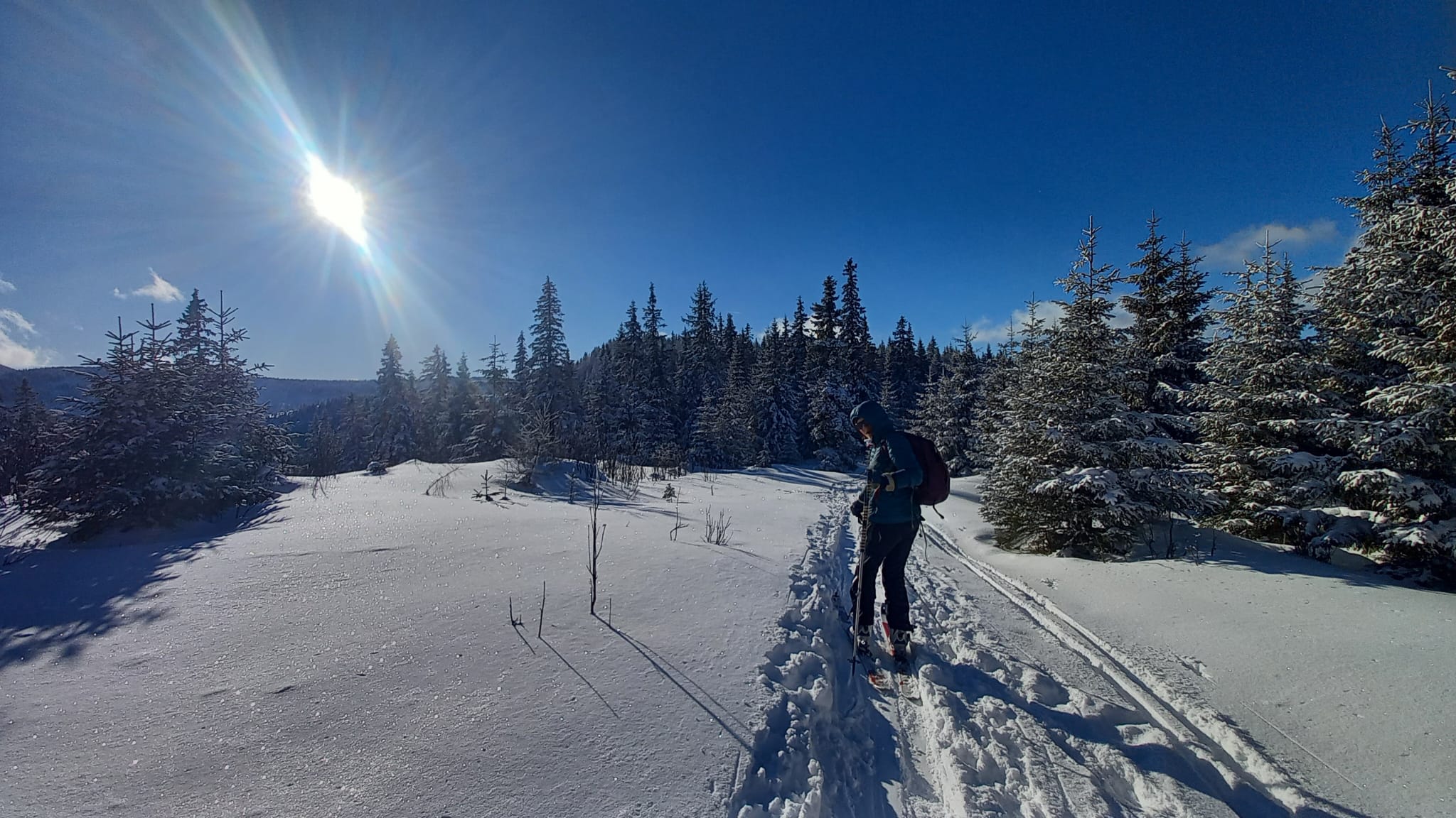 Nedávna víchrica tu narobila škody a okrem toho, že pováľala stromy, tak vyfúkala sneh až po trávu. Kúsok musíme ísť peši, kým opäť zapneme lyže. Potom už zlyžujeme po zjazdovke dole až ku autu.