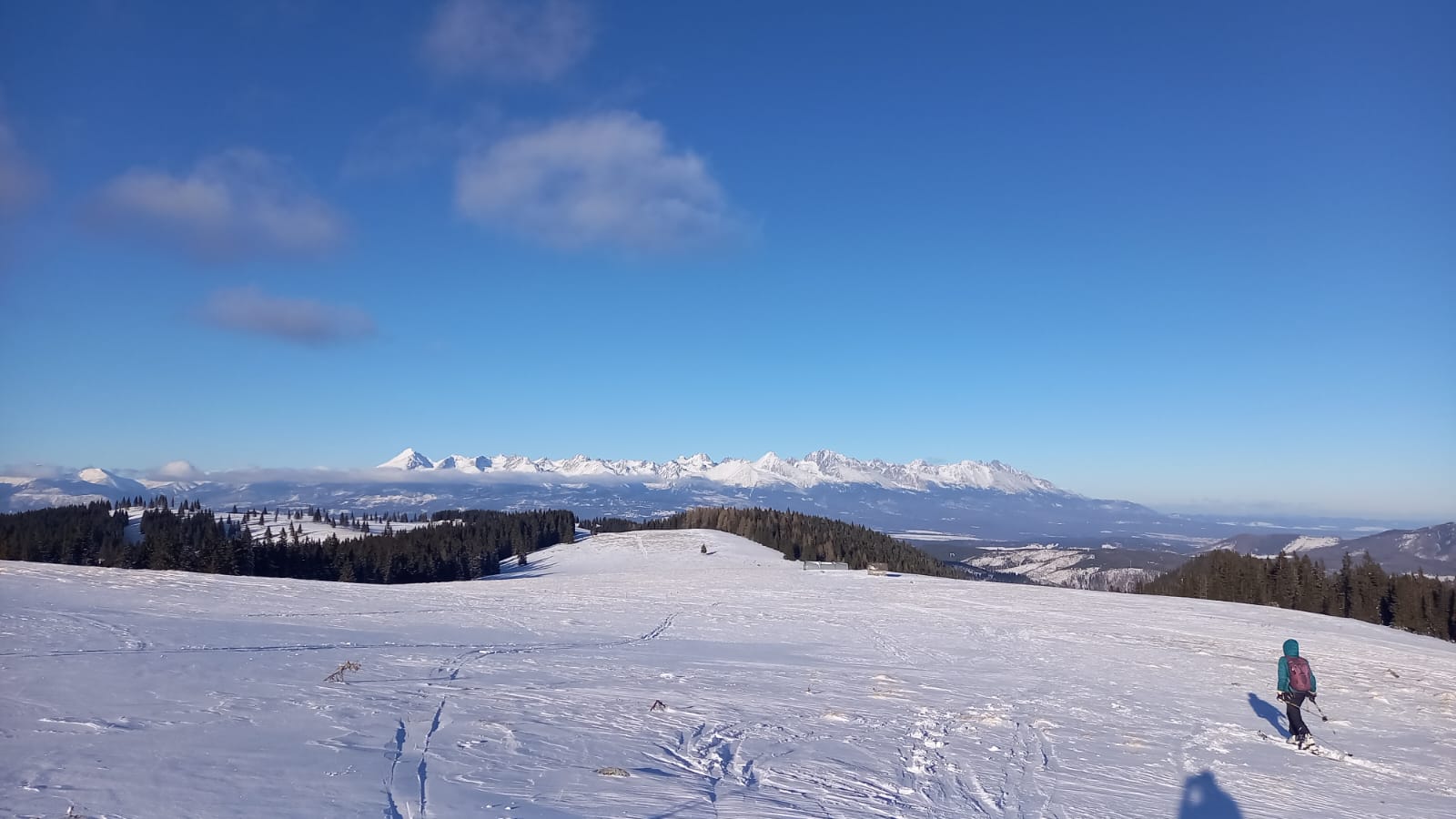 Pri východe z lesa na lúky je snehu dosť, nadmorská výška je tu ako na Štrbskom plese. Z Panskej hole sa dá šliapať ďalej po žltej značke, hrebeňom až ku chatke Budnárka. Otáčame ale kúsok skôr a po lúkach ideme až na Smrečiny ku hornému koncu vleku.
