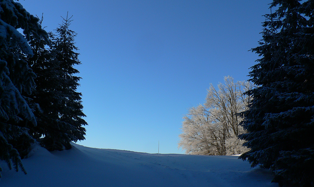 No a záver – už len do Lúžnej sa doplaziť voľajako... Tak ešte traverz popod Veľkú Chochuľu a Košarisko, krížom cez ďalšie oblúkmi pokreslené muldy a svahy, ktoré síce lákali, ale času už nebolo. V sedle pod Košariskom pásy dole. Chvíľa rýchla po vytvrdenom hrebeni, potom tri chvíle bežkovania, palicovania a korčuľovania v snahe dostať sa bez pásov do sedla pod Skalkou. Skoro sa mi to podarilo, ale nového snehu v nižších polohách pribúdalo a vlhol. Tak ešte posledné naliepanie na krátkych pár minút mierne do kopca, aby som sa na žltú dostal, a potom už popri kríži a po rúbaniskách „rýchlo a zbesilo“ dole. Inak celkom dobré lyžovanie by to bolo – lebo tvrdo, ale nie ľadovo, v lesíku pod krížom aj prašanové záveje. Ale čas odchodu autobusu sa blížil a či dolyžujem až do dediny, to som netušil.
