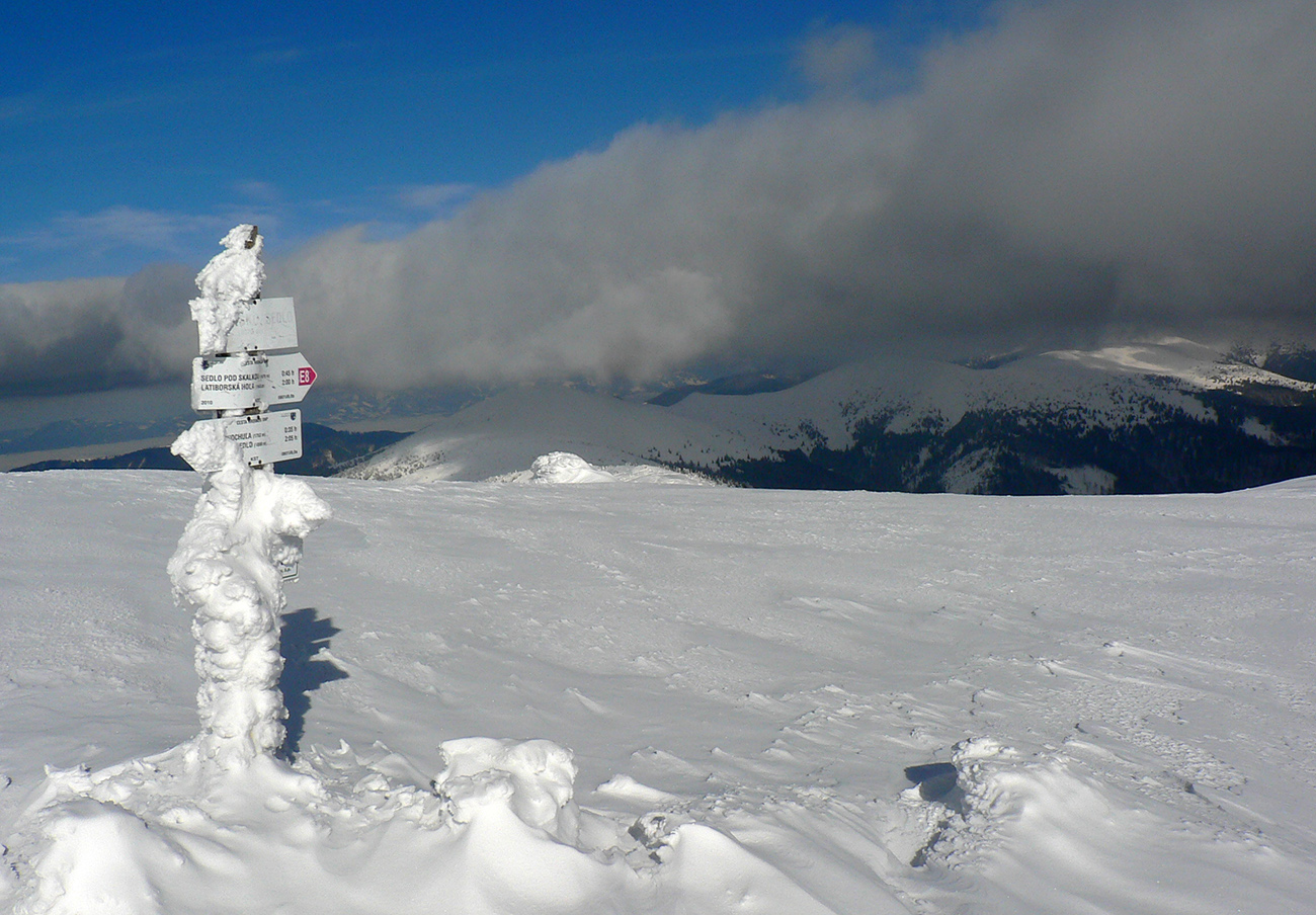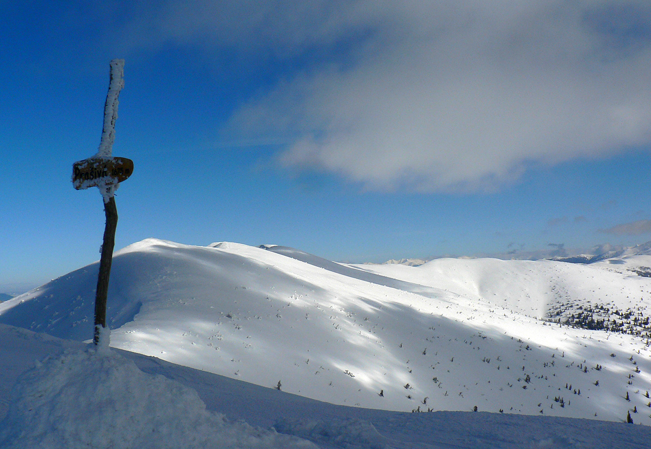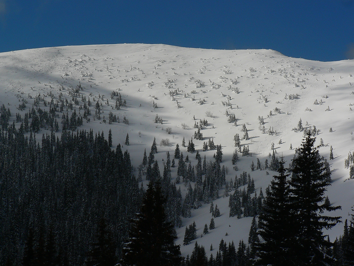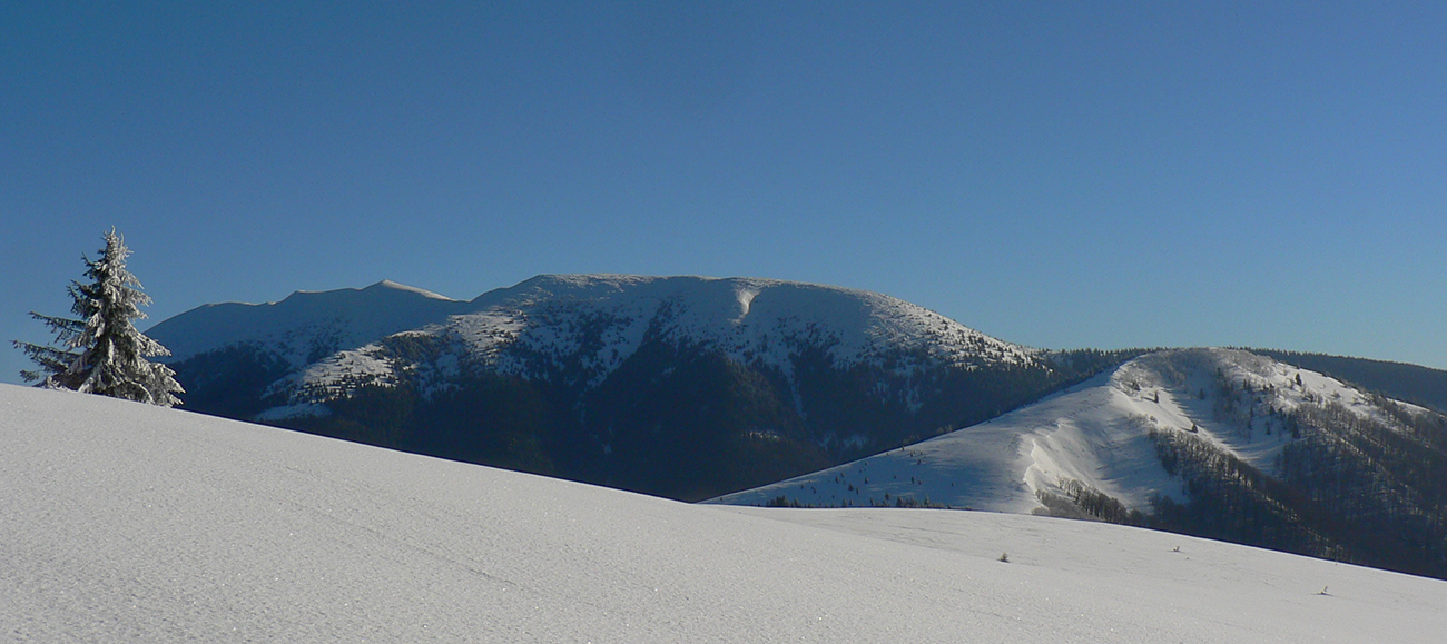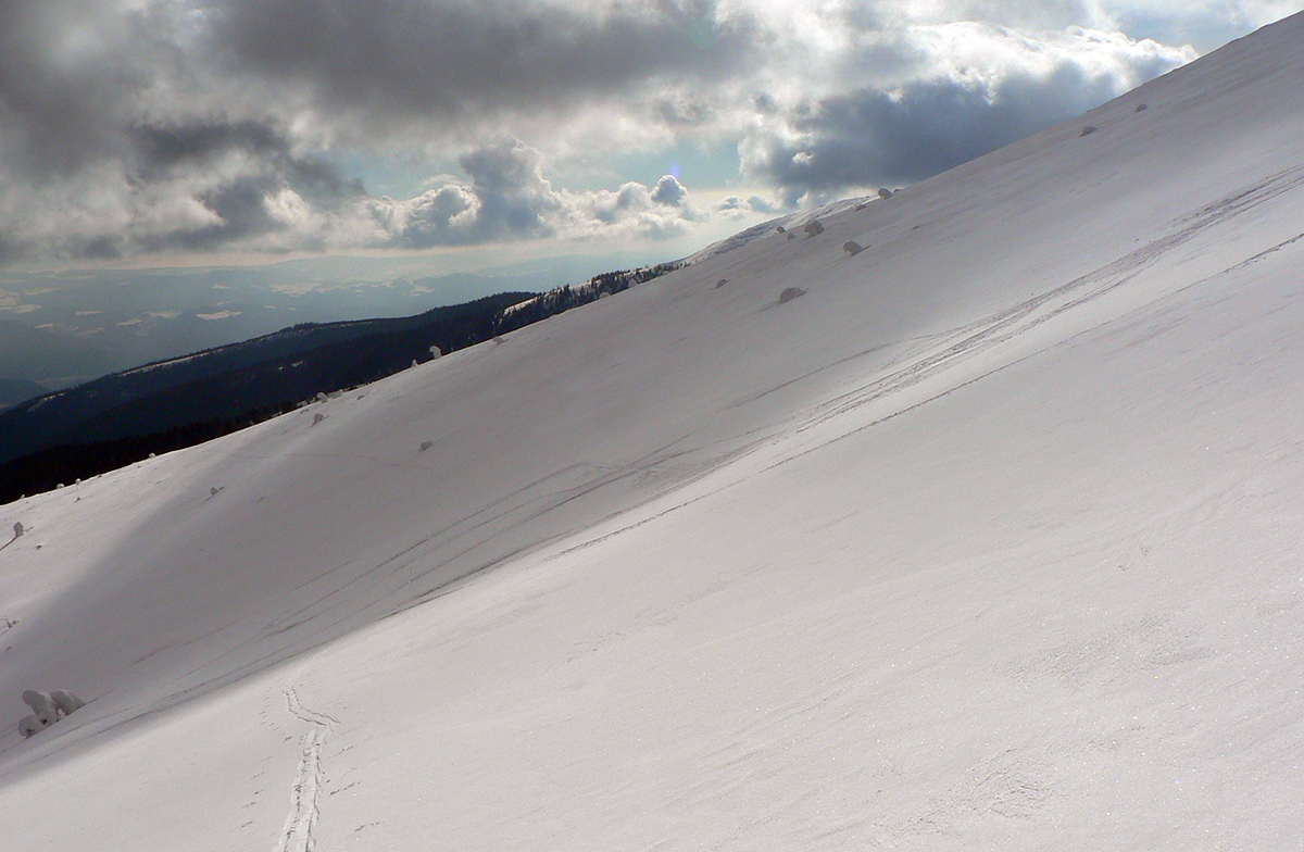 Po arktickom počasí sa zase dovalil hnusný odmäk, no prvé dni ešte vo vyšších polohách moc neuškodil. Naopak – aj dobre spravil, keď prilepil k zamrznutému podkladu nový sneh. Šialená zima, ako na hojdačke... Ale čo už. Šiel som teda vyskúšať tie vyššie polohy masívu Prašivej. Mal som viac variantov „denného programu“ podľa toho ako nohy pôjdu. Rýchlo sa ukázalo, že nejdú vôbec, tak som to nehnal po hrebeňovke, ale ostal som tam polyžovať. A dobre som spravil a nebol som sám – na starom ľade taká hutná, vetrom a už aj slnkom ubitá vrstva nového snehu, do 10 cm. To na juh. Od hrebeňa až do lesa takmer žiadny ľad. Len na hrebeni miestami trochu tvrdšie šindle, strungy, kto to už ako volá. Severy samozrejme tvrdé, vyfúkané, hrboľaté, tam som ani nešiel. Ale po nedávnom lavínovom poplachu ani stopy.
