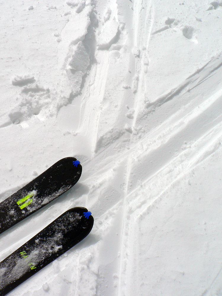 Potom už klasika po červenej cez Kečku a Kozí chrbát do Hiadeľského sedla – za rána ešte na pláňach suchý podklad, jemná vrstvička na starom ľade, dobré šmyky. Zjazd z Kozieho chrbta ale už mokrota, po každom oblúku ma snehové slimáky naháňali. Podobne smerom hore na Prašivú – na čistinkách vystavených slnku už to lepilo, musel som pásy prevoskovať.