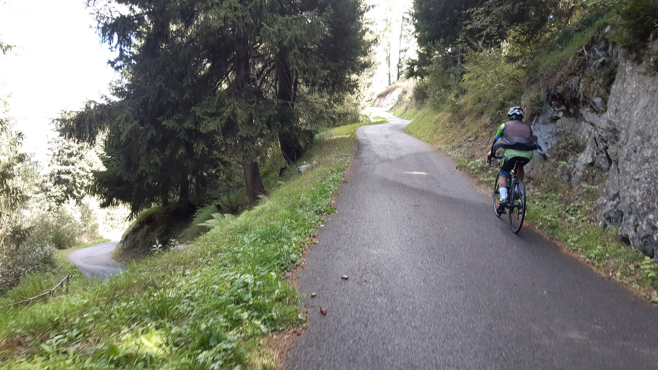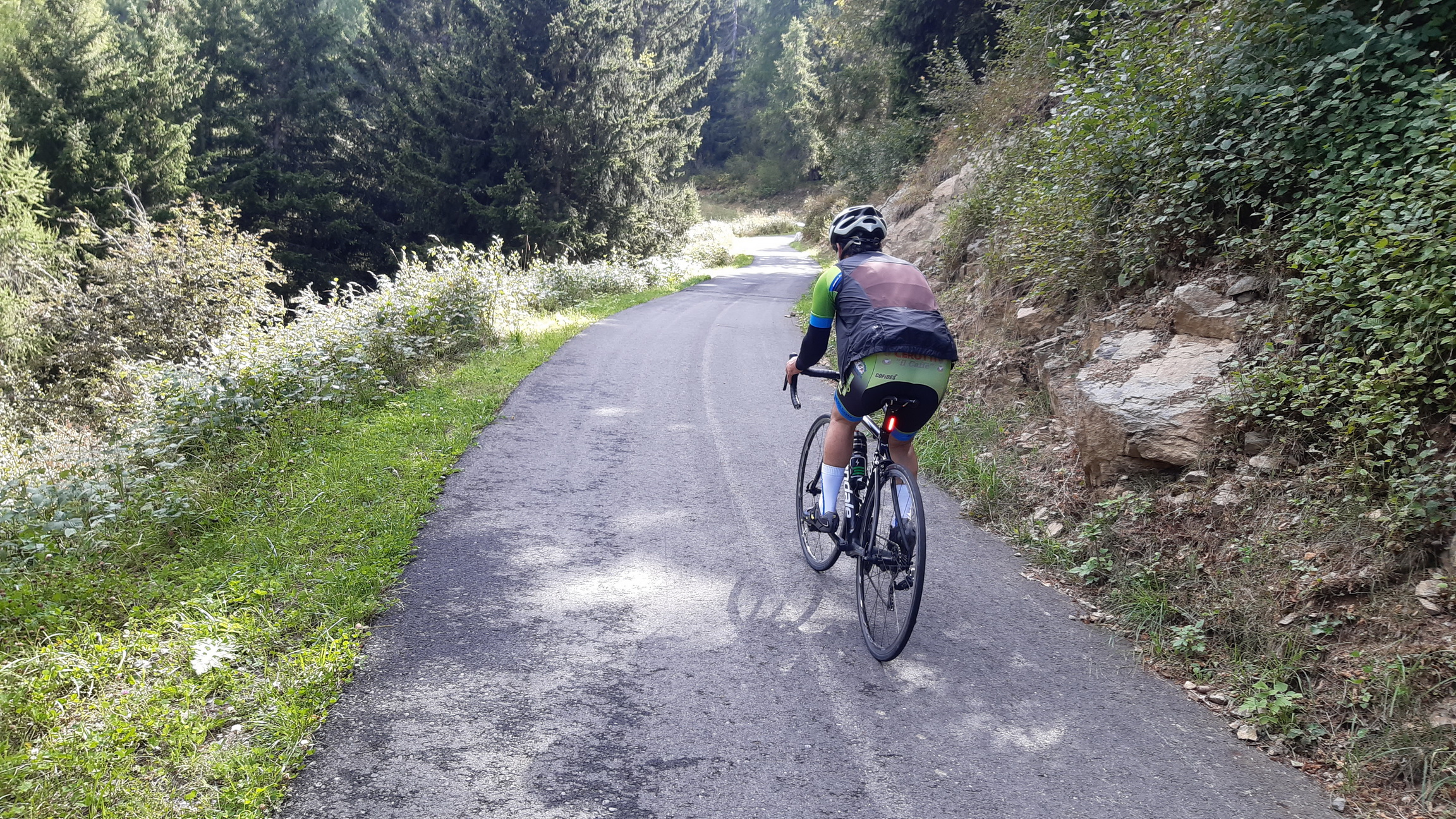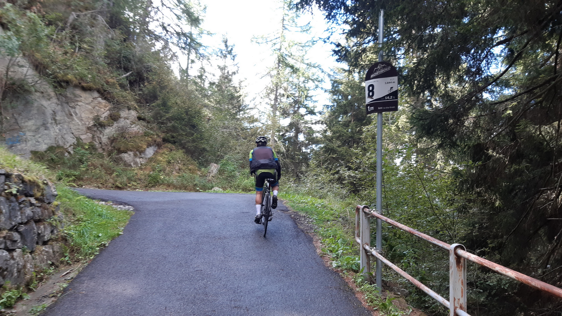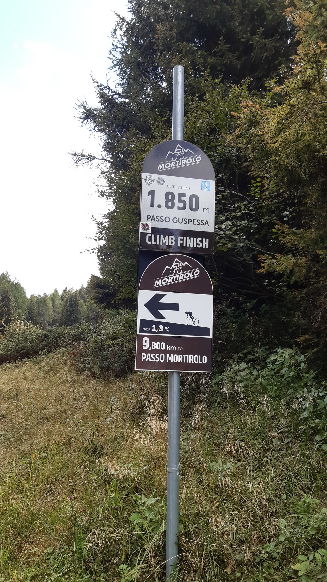 Stúpanie ako dva Sliezske domy za sebou, úzka cestička, neustále serpentíny bez prerušovania rovinkou, kvalitný, miestami nový asfalt, každá serpentína označená infotabuľkou a niečo, čo snáď ani nemôže byť pravda: zákaz vjazdu autám! Toto je passo Guspessa - nenápadné, v hustom lesíku ukryté stúpanie hneď vedľa Mortirola.