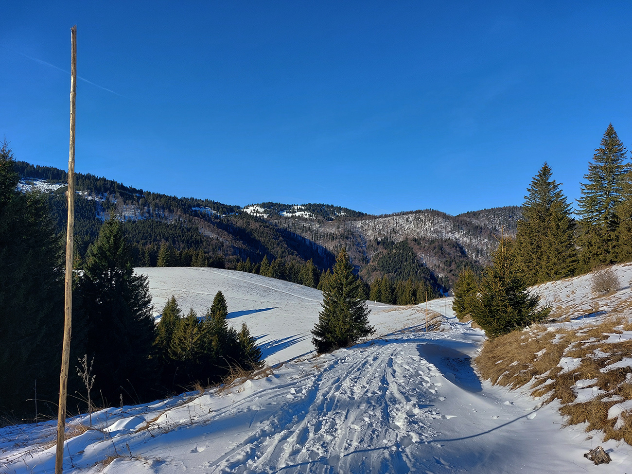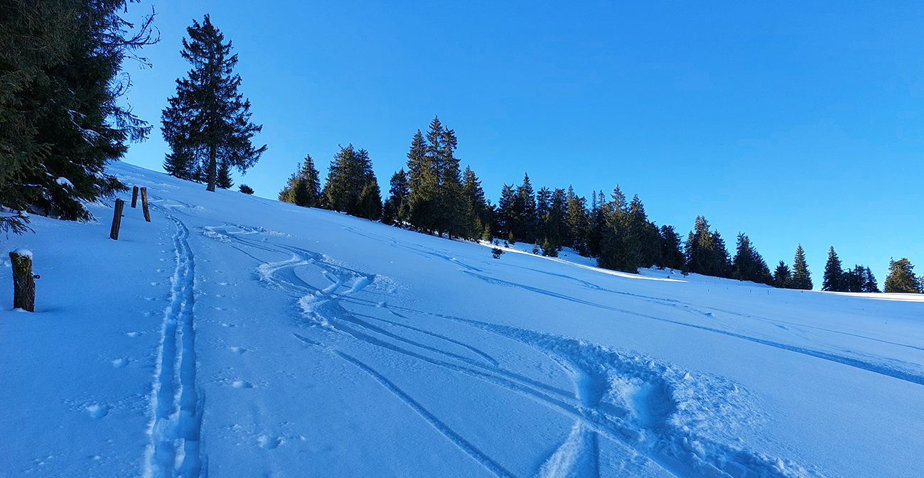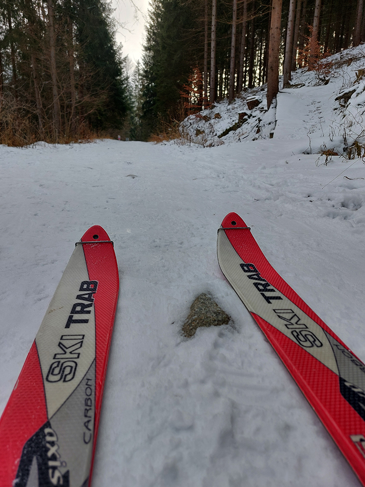 Slnko nízke, ukryté za stromami, prášku (kolo obeda už troooošku vlhnúceho) tak 10 cm, pod tým niečo staršie a hutnejšie, no fakt lepšia voľba ako striedať lepidlo a vatu na hrebeni smerom na Smrekovicu. Krátke síce, ale parádne lyžby, každá dĺžkou tak akurát na jeden záťah.