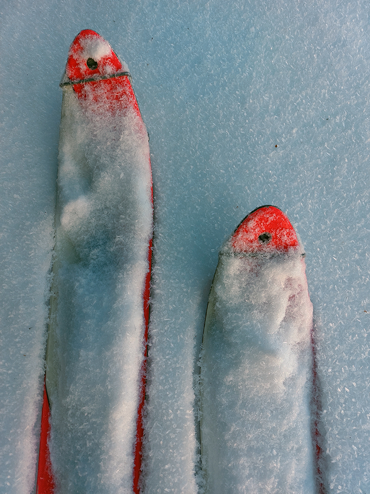 Aj voda poruke k obedu, aj som nakoniec vlhké pásy vymenil za suché, keď už voskovanie nepomáhalo, a naposledy som si ešte z povinnosti vyskúšal muldu vedľa, skoro celú na slnku, až zhora, z vyhliadkového kopčeka na červenej značke. Nejaké staré oblúky tam boli, tak že pridám svoje. Ale bolo to zároveň aj navlhnuto ťažké, aj krustovité, no takmer hnus, nič moc zážitok. Až dole v tieni pár práškových oblúkov na vylepšenie záverečného pocitu.