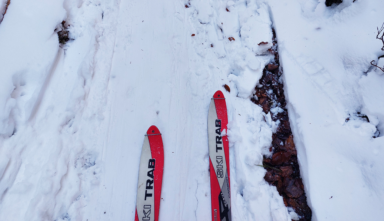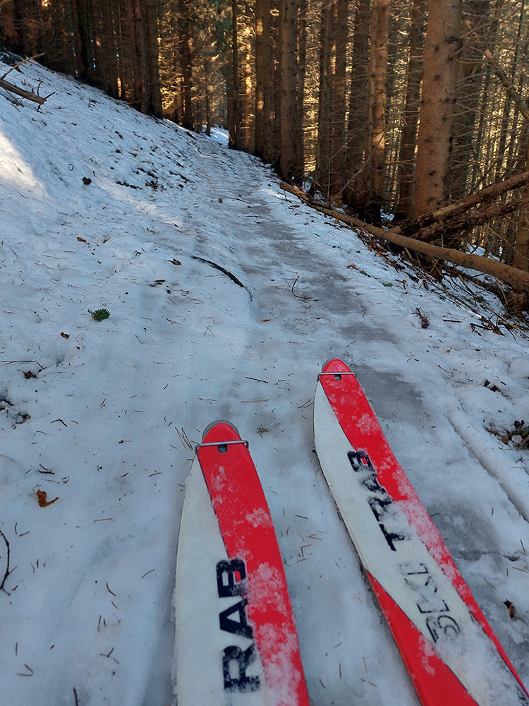 Tak už len odjazd – cestou pod Vtáčnik mi to išlo (mám dojem) lepšie na pásoch po tej špine napadanej zo stromov, ako na sklzniciach, už zbavených vosku. Cesta k Mederličke ešte zúfalejšia ako ráno a za chatou ten krátky úsek hustým lesom na zjazdovku čisté zúfalstvo – viac hnedej ako bielej. Pozajtra tam budú hríby rásť. Takže už len po umeláku, po zjazdovkách, odjazd dole. Aspoň v tomto je to Malino super.