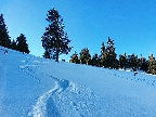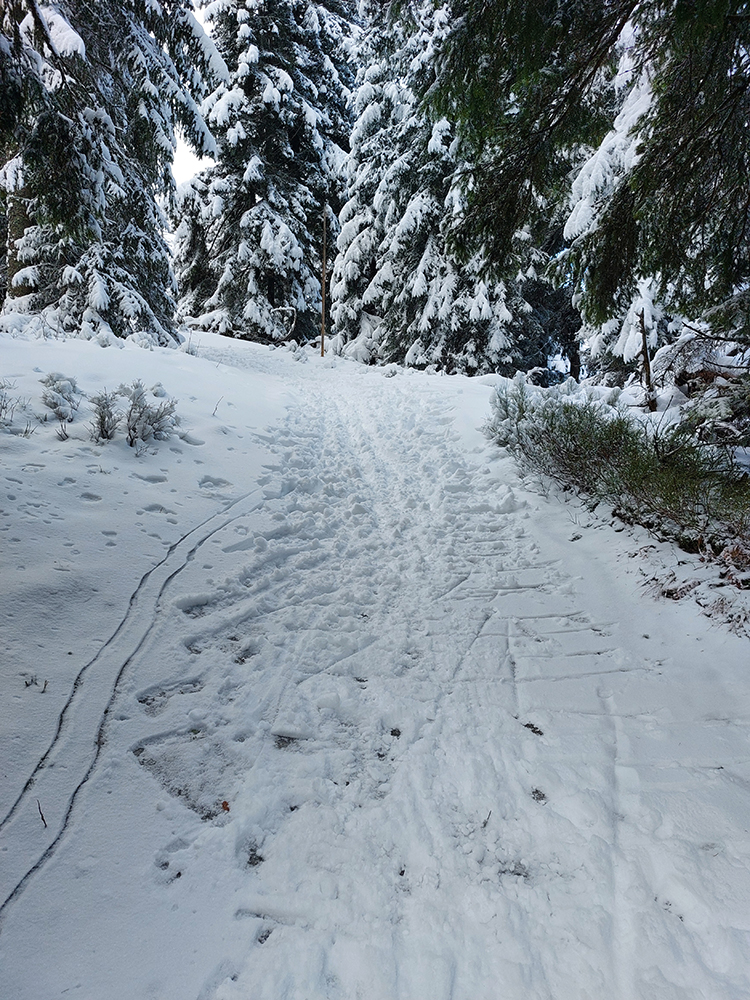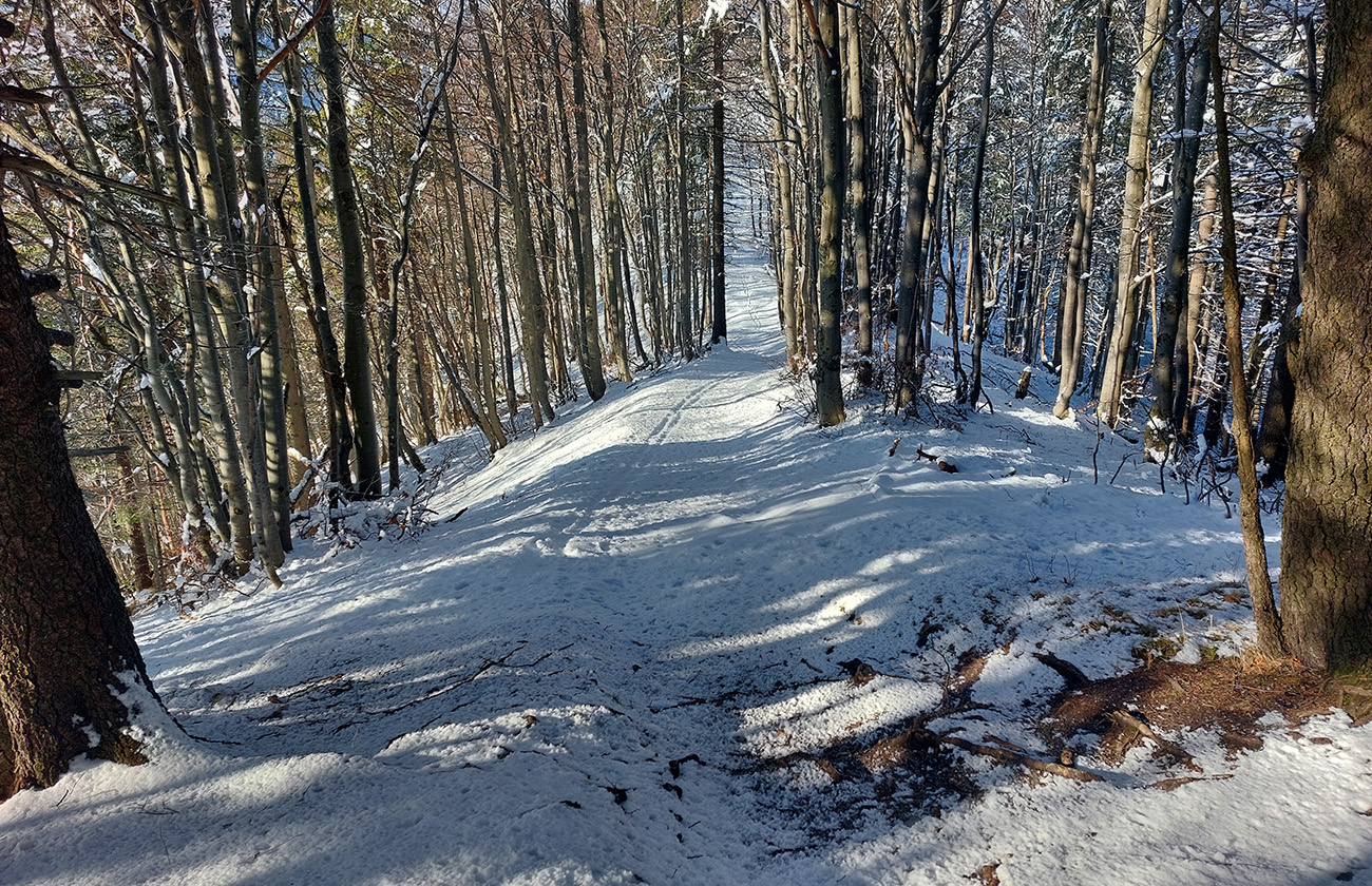 Lebo som to za Mederlyčkou skusmo otočil doprava hore, smerom na modrú značku okolo Nemeckého vrchu. Strmší výstup po napojenie na značku ako tak, aj keď snehu ledva. Potom v smere na Vtáčnik nič moc, opačný smer je lepší, lebo viac do kopca a dosť koreňov trčí.