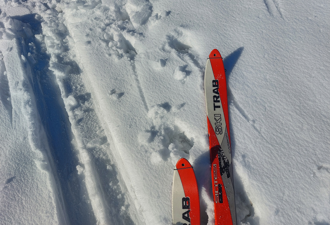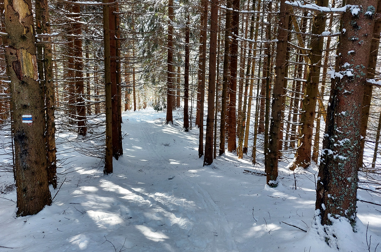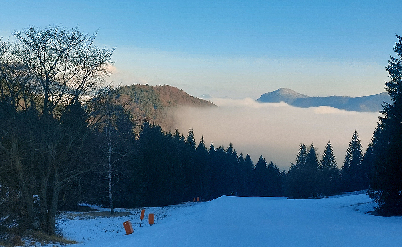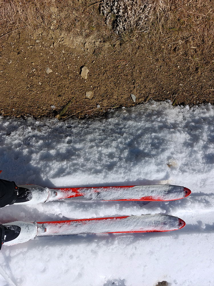 Noooo hej, napadlo – od päť do dvadsať čísiel, na žiadny základ. Alebo teda na ľadový, vo vyšších polohách. V nižších polohách možno aj posledný raz tejto zimy. Na strmých svahoch nová perina neprilepená a hrozba lavín, v nižších polohách nula snehu, tak ako sa dostať tam, kde by sa dalo aspoň poprechádzať? Nájdu sa isto aj miesta, kde sa dá dobre polyžovať, ale treba vychádzať z reálnych možností. Takže požiadavka znela: nenosiť a neprenášať dlho a najlepšie ani často pásy neodliepať. Preto vlakom do Rybárpoľa a po 20 minútach pešovania lyže na sneh - na umelý, zjazdovkový, široko – ďaleko jediný, ako inak. O siedmej ráno, nech potom nezavadziam. A samozrejme som nebol jediný ani prvý. Niektorí ranostaji už tam po výšľape balili kšeft. Vzal som kameňáky a aj pásy som nahodil tie najstaršie, lebo som tušil, že na ľadovom menčestri budú stačiť a vyššie v lesoch im poukrývané zákernosti nebudú až tak vadiť. Dole sviežich vari mínus päť, cez deň vraj o 10 viac, hore malo byť cez deň mierne pod nulou.