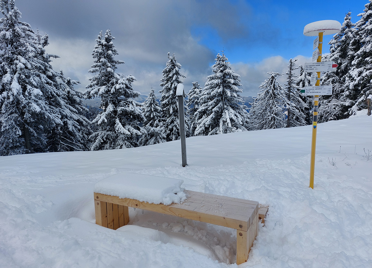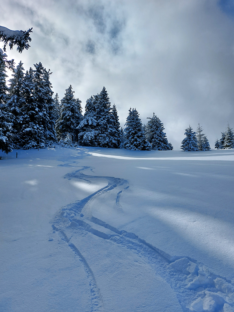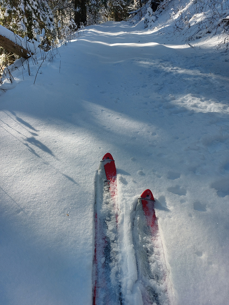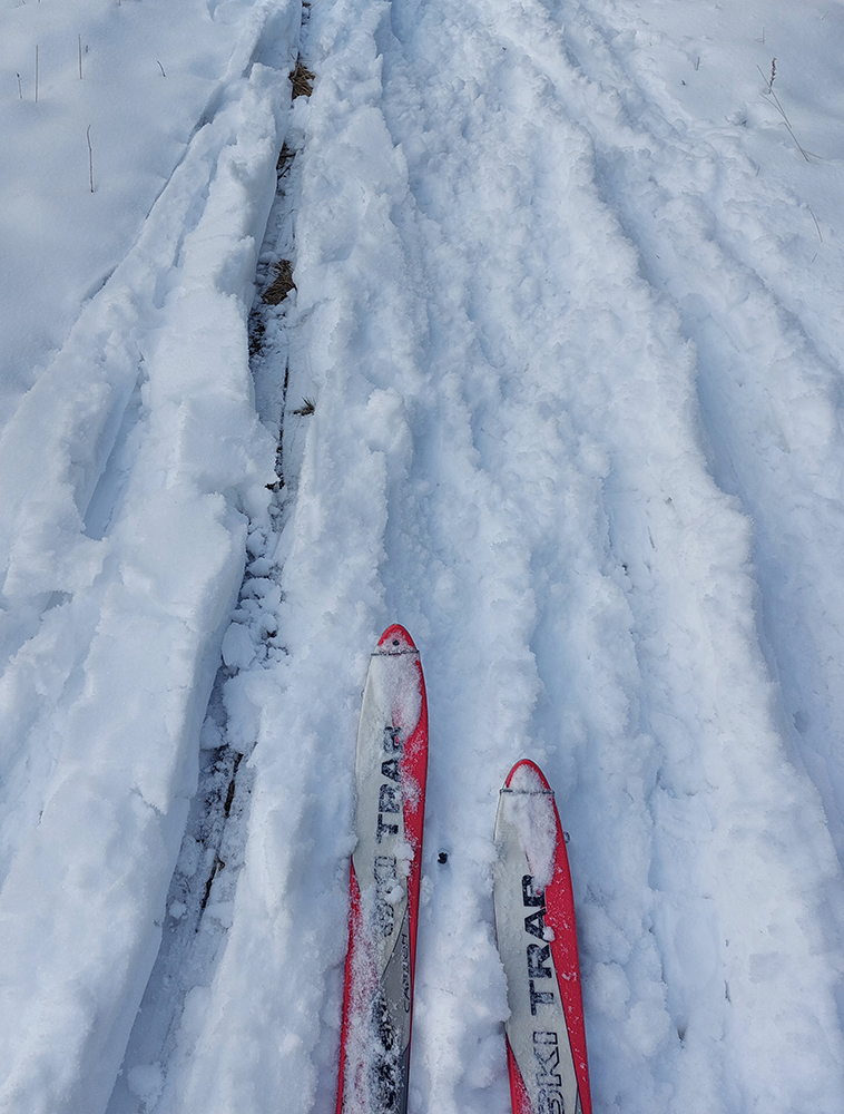 Noooo hej, napadlo – od päť do dvadsať čísiel, na žiadny základ. Alebo teda na ľadový, vo vyšších polohách. V nižších polohách možno aj posledný raz tejto zimy. Na strmých svahoch nová perina neprilepená a hrozba lavín, v nižších polohách nula snehu, tak ako sa dostať tam, kde by sa dalo aspoň poprechádzať? Nájdu sa isto aj miesta, kde sa dá dobre polyžovať, ale treba vychádzať z reálnych možností. Takže požiadavka znela: nenosiť a neprenášať dlho a najlepšie ani často pásy neodliepať. Preto vlakom do Rybárpoľa a po 20 minútach pešovania lyže na sneh - na umelý, zjazdovkový, široko – ďaleko jediný, ako inak. O siedmej ráno, nech potom nezavadziam. A samozrejme som nebol jediný ani prvý. Niektorí ranostaji už tam po výšľape balili kšeft. Vzal som kameňáky a aj pásy som nahodil tie najstaršie, lebo som tušil, že na ľadovom menčestri budú stačiť a vyššie v lesoch im poukrývané zákernosti nebudú až tak vadiť. Dole sviežich vari mínus päť, cez deň vraj o 10 viac, hore malo byť cez deň mierne pod nulou.