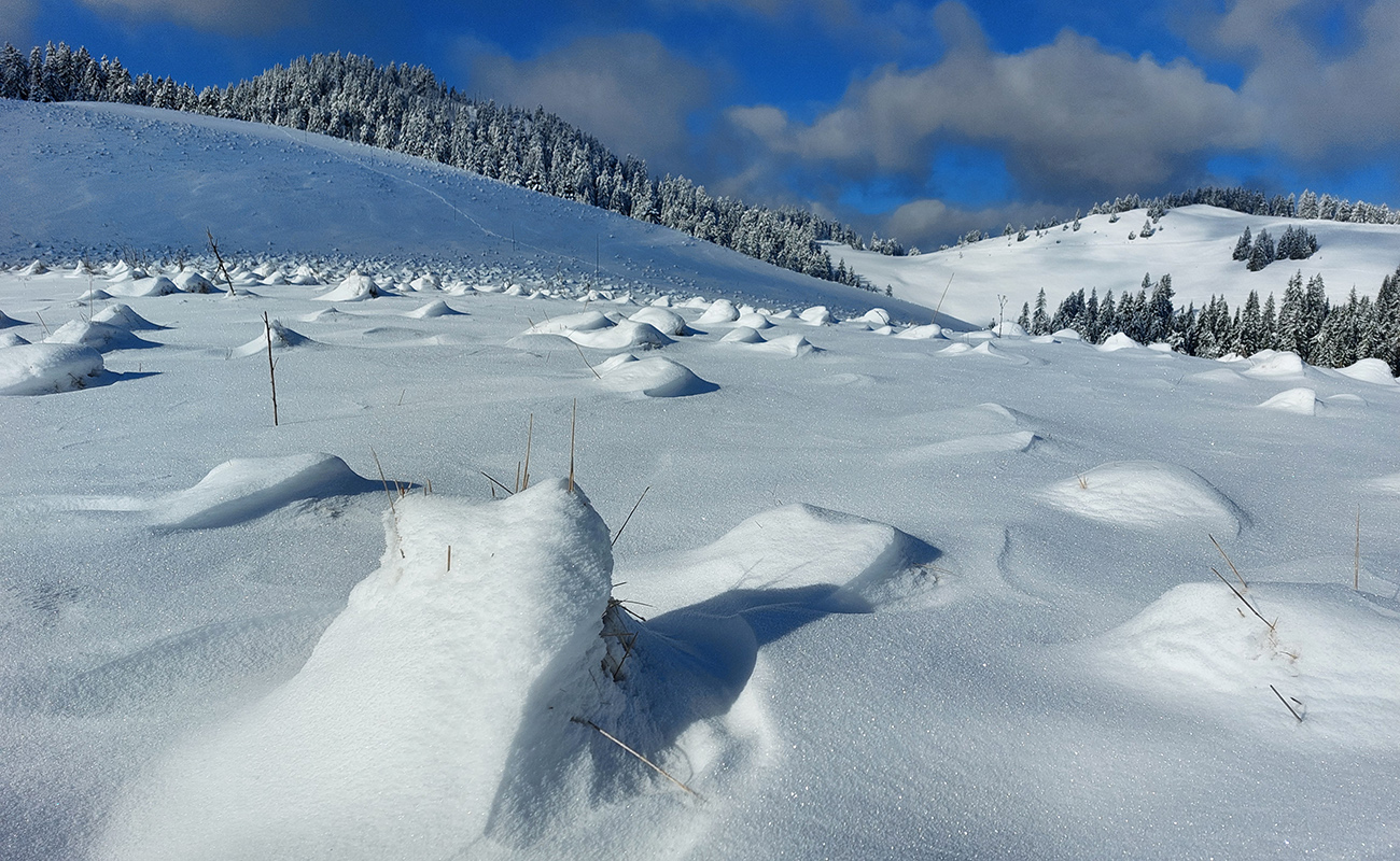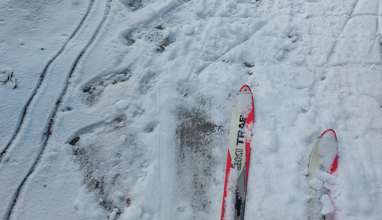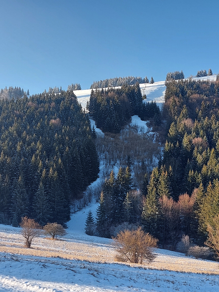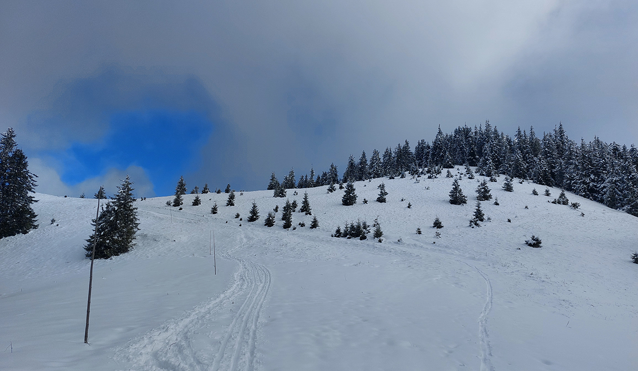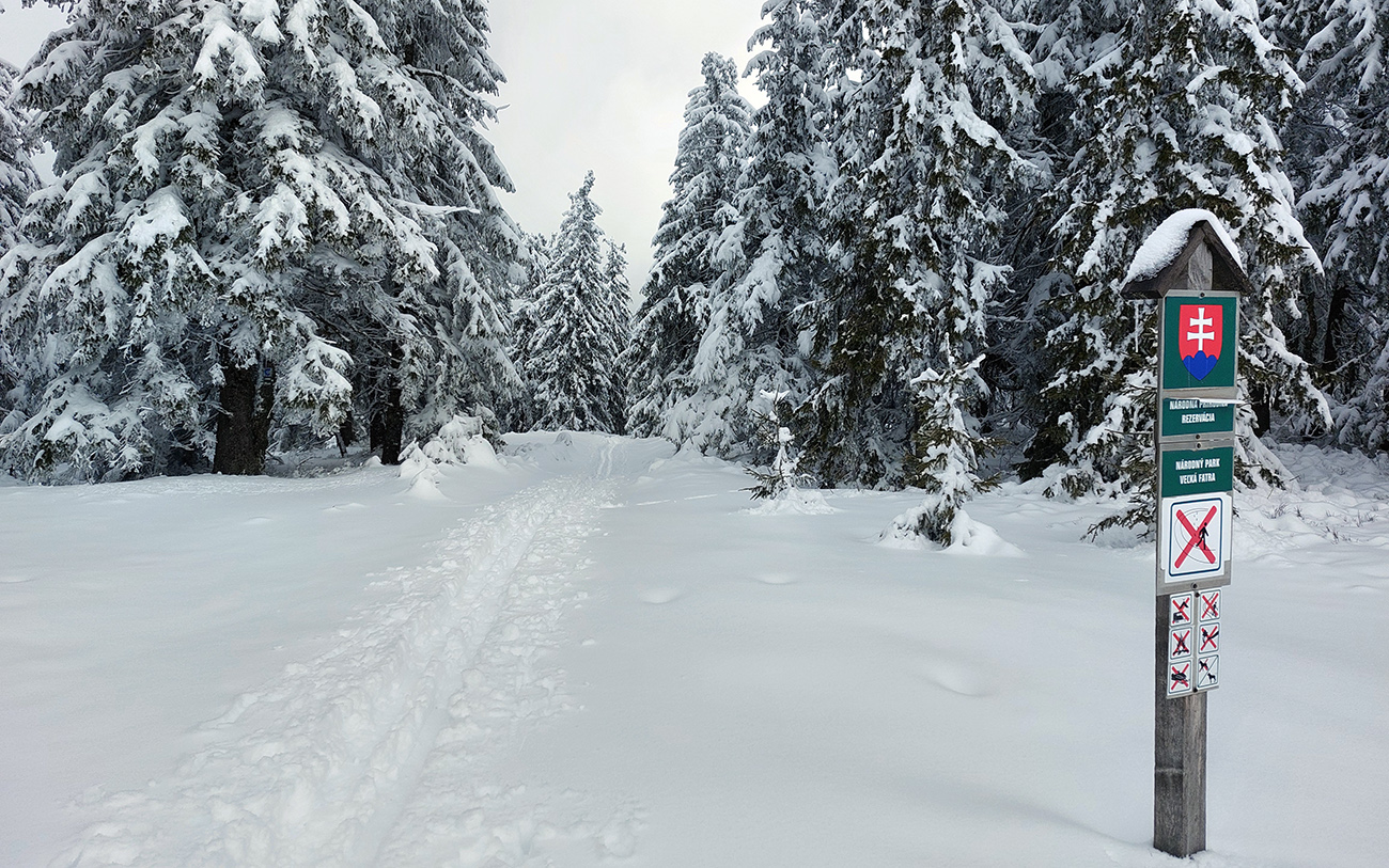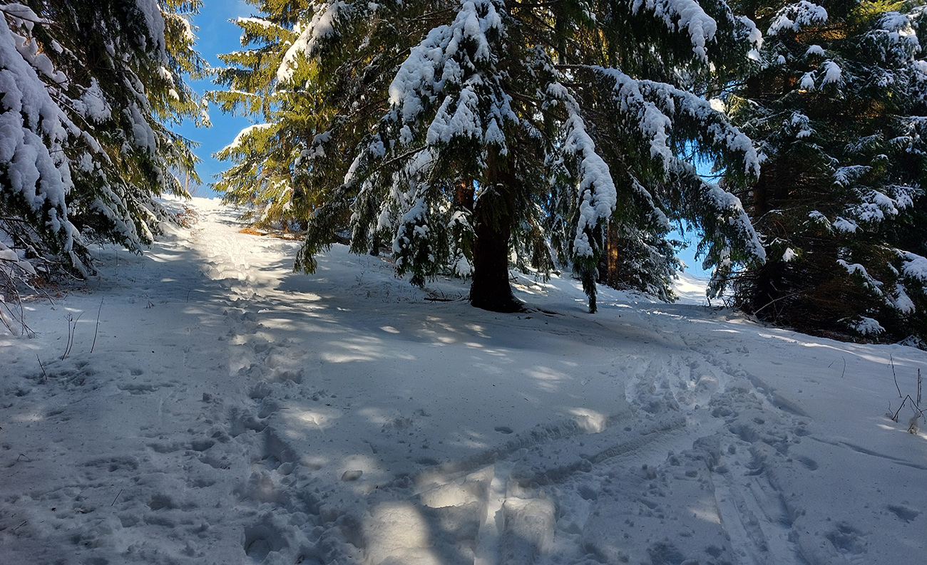 Na lúkach na cyklotrase medzi Vtáčnikom a Šiprúnskymi sedlami to vyzeralo rozprávkovo, ale hroty palíc klopali o zem a kôpky prisnežených trávových trsov žalovali o nízkej hladine snehu. Niekde naviatych aj 20 cm, no na viacerých miestach pod hustejšími korunami ledva cenťáčik a smejúce sa pirane.