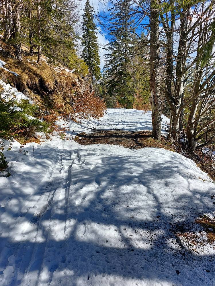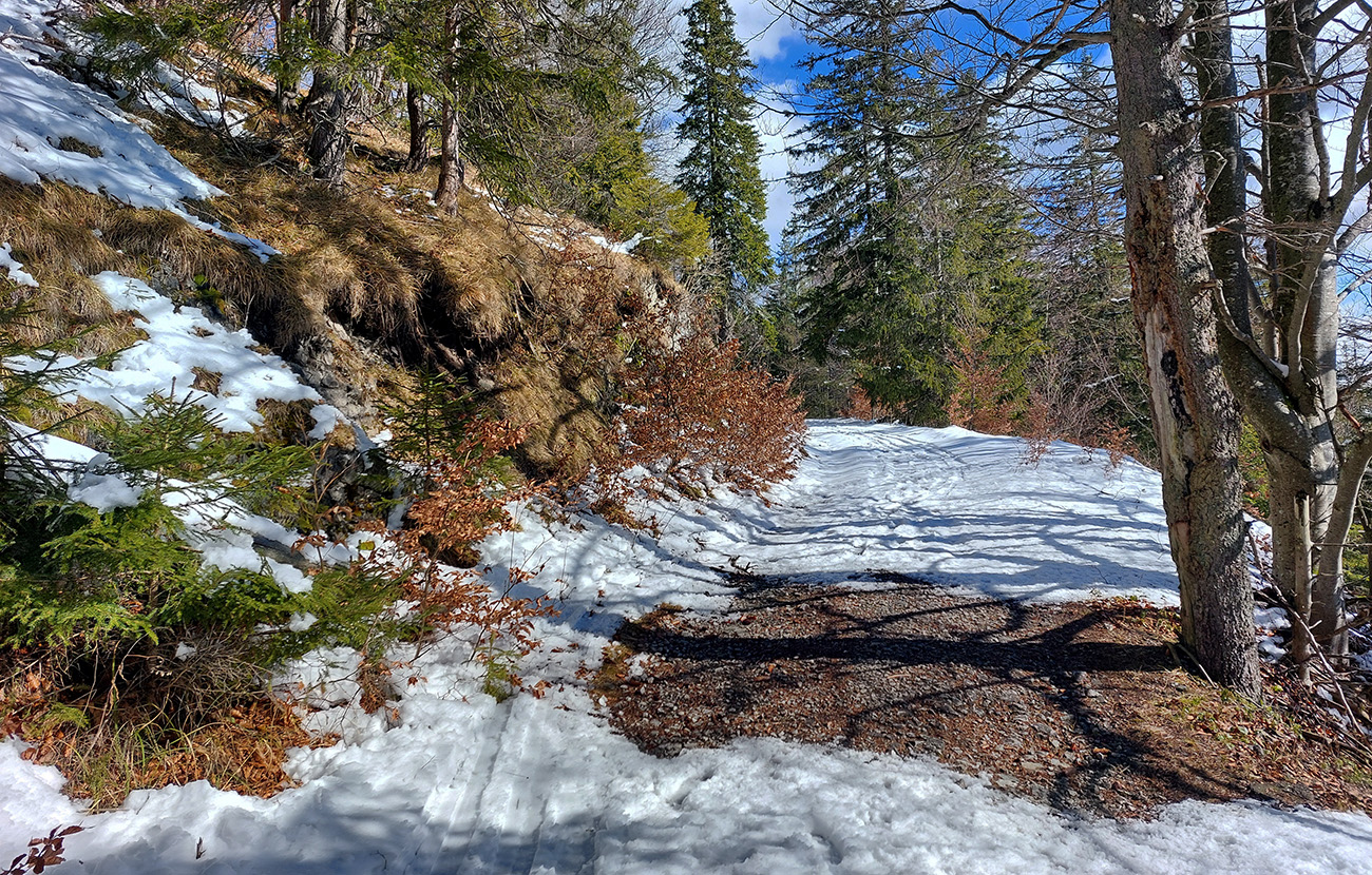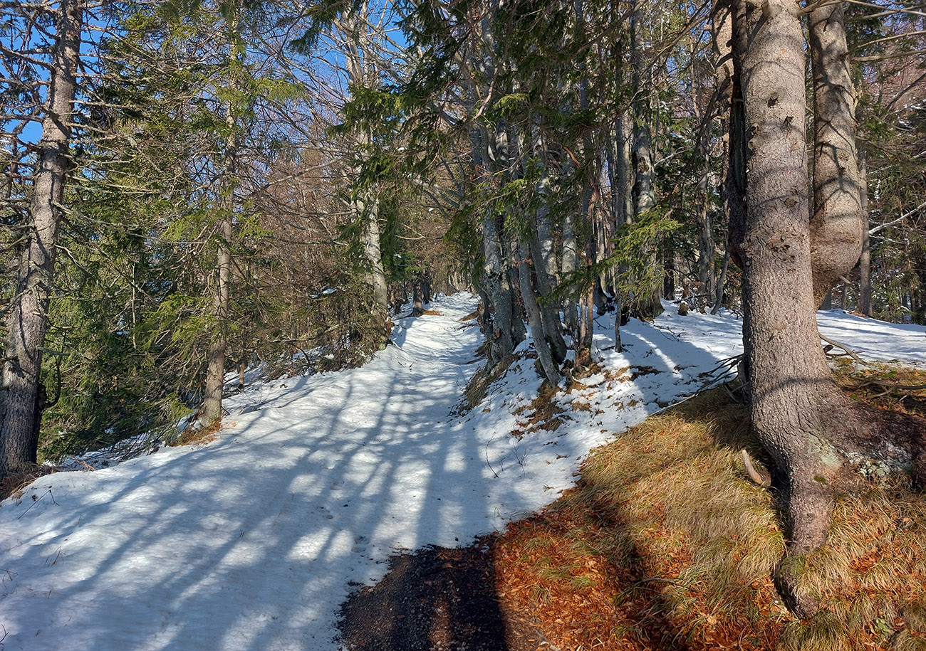 Traverz cez Mederlyčku pod Vtáčnik použiteľný komfortnejšie ako v polovici januára, keď som tam bol naposledy – aj v hustom lese viac snehu, opatrne sa dá oboma smermi, aj keď pirane cvakajú zubami. Len na ceste v riedkom lese, otočenej na juh, už bolo pár fľakov, kde to nepotrvá dlho a bude tam treba vyzúvať. Tú čerstvú, riedku vatu slnko lízalo rýchlo, fotka je už z cesty nazad: