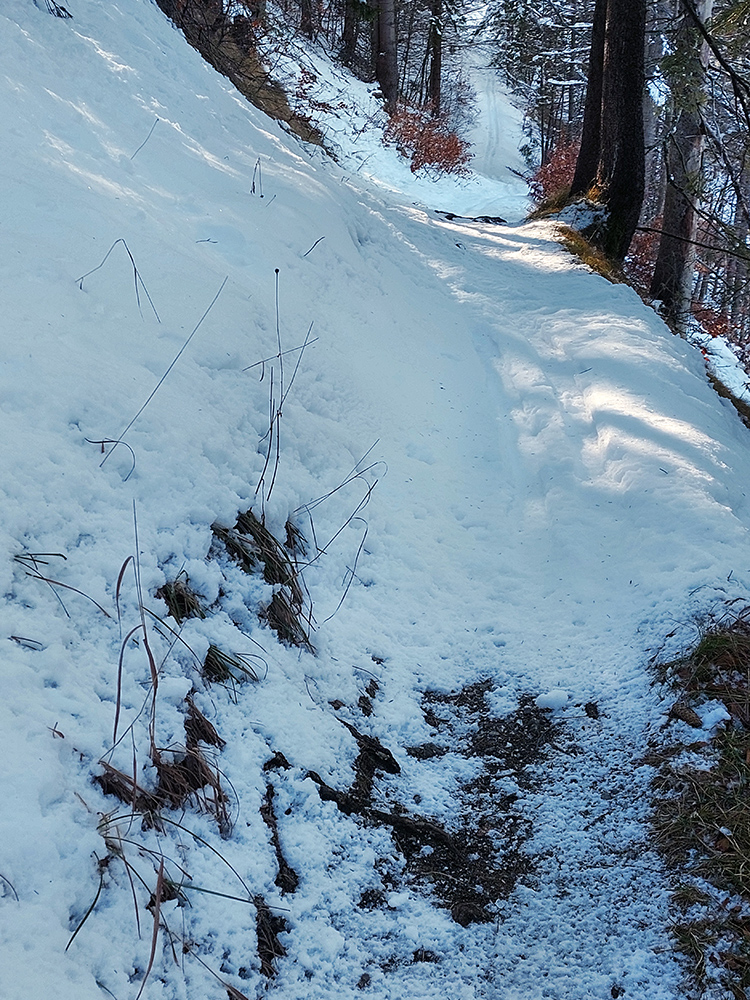 Posledný horekopec cez Jánošíkovu kolkáreň – hrboľatý komfort, lebo viac pešiakov ako lyžiakov prešlo. Aj tam v strmom pár nepríjemných miest, len s tenkou vrstvičkou snehu, ktorý ledva kryl kamene. Pri návrate bude tade treba ozaj opatrne. Aj úzko je tam, a nedá sa, keď je málo snehu, povedľa chodníka dobre brzdiť.