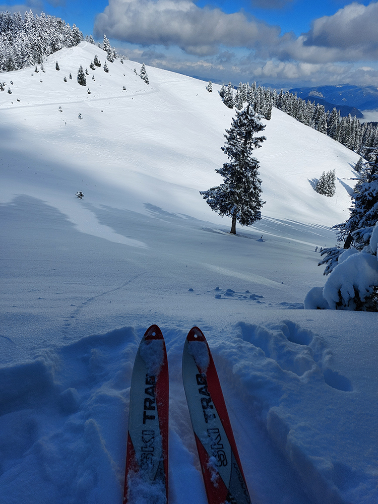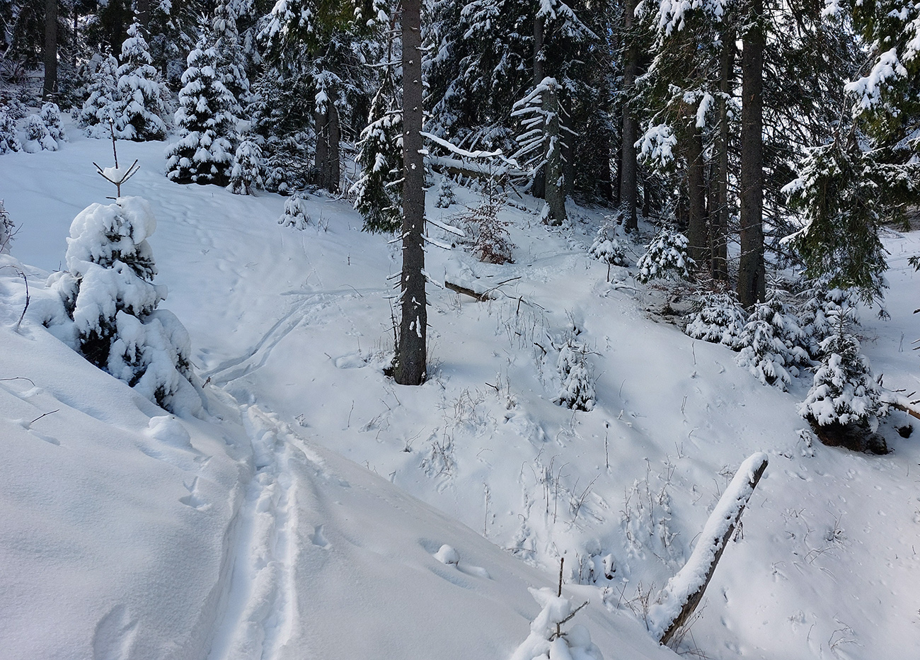 Pozornejší pohľad do jamy pod Nižným Šiprúnskym sedlom ma usvedčil v tom, že práve tade chcem obísť tie spomínané nepríjemné miesta na cyklotrase (pri zostupe spod Šiprúňa pod Vtáčnik). A oplatilo sa a ešte aj potešilo! Lyžovačka lepšia ako vtedy v januári, lebo na ľadovom základe naprášených takých odhadom 10 cm ľahučkého, premrznutého prášku. Tentokrát som nechal aj ostatným, choďte tam!