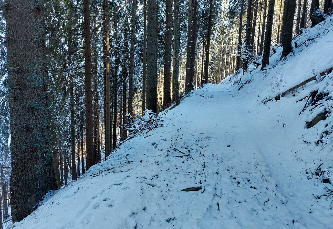 Na zvážnicu cez rúbaň nad záverom Čutkovskej doliny som to vytlačil relatívne komfortne, snehu je tam pod stromami málo, ale aj tých stromov je tam málo :-) A potom som sa už bezpečne zviezol dole do lesa, snehu dosť, lebo ani tam moc slnko nezasvieti: