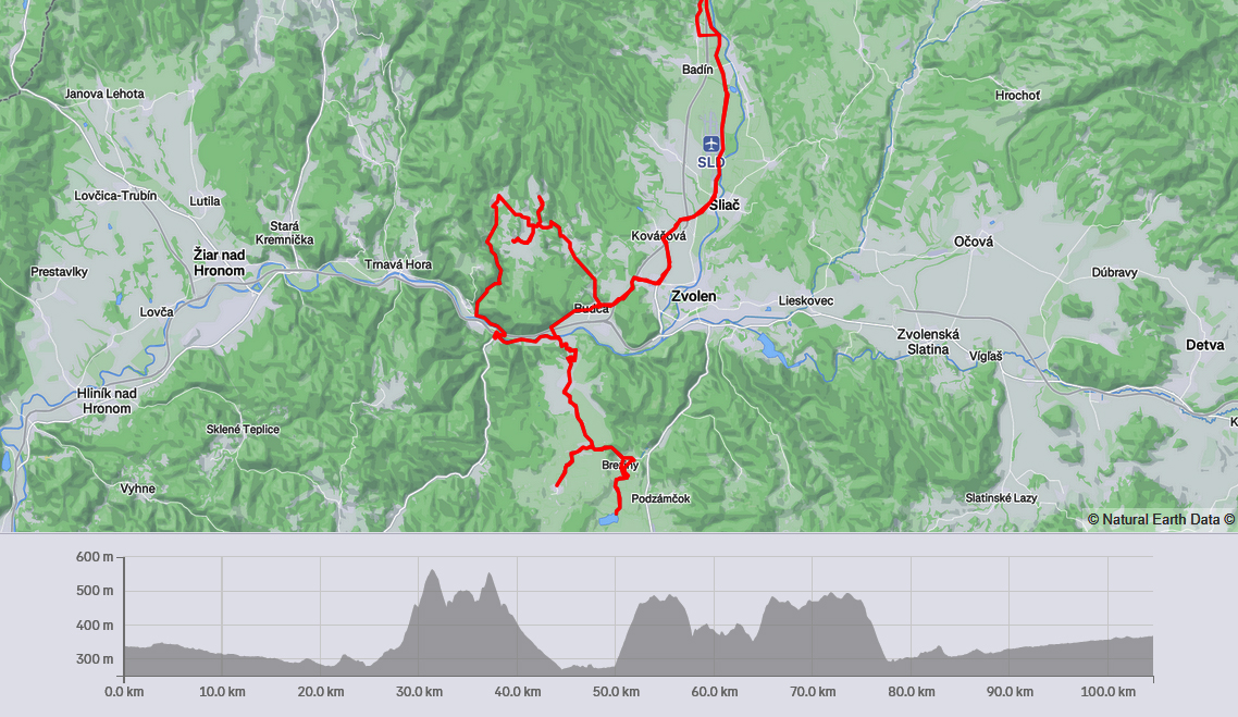 Víkend, počas ktorého fičala prvá ultrabežecká stovka v sezóne u nás (Letecká) bol hriešne suchý a teplotne príjemný, nedalo sa odolať – vytiahnuť cesťák na dlhší výjazd :-) Keď už som sa na Leteckú v nutnom veľkom predstihu neprihlásil s nádejou, že budem ešte lyže drať. A nie, že by som Pino už predtým párkrát nevyvenčil, ale to len okolo domu, tak nadišiel čas aj inde sa pozrieť. A že mám ten týždenník na vlak, odviezol som sa do BB a odtiaľ už po vlastnej osi obzerať kopčeky okolo Hrona na západ od Zvolena. Takže tých prvých a posledných 20 km si netreba všímať, to dôležité je v sľučkách na mape v okolí Budče, Tŕnia, Železnej Breznice, Hronskej Dúbravy, Ostrej Lúky, Brezín, Bacúrova a Dubového. Krajina pekná, aj keď ešte predjarne sivá, ale výhľady cykloturisticky pozitívne a asfalty fajnové, tak som sa ani nedivil, že som tam nebol sám: