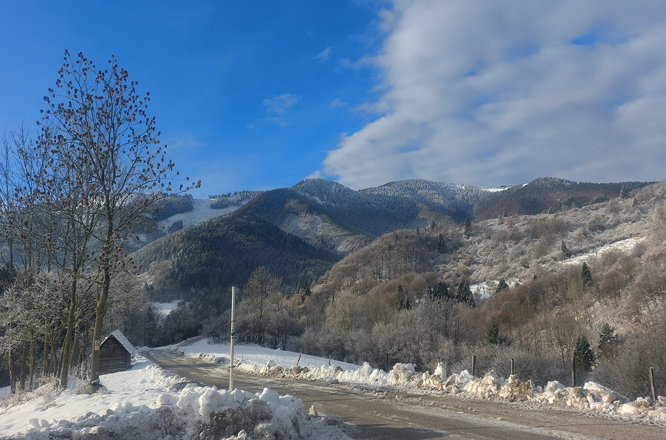 Nad dedinou do lyží! Ale do Sedla pod Sidorovom nie po značke, tá cesta je do štrku odhrnutá. Po vedľajšom chodníku komfortne, popri starom vodovode. Dole už to bude horšie, najmä v strmších miestach, k slnku otočených, vytopené miesta a žiadny podklad.