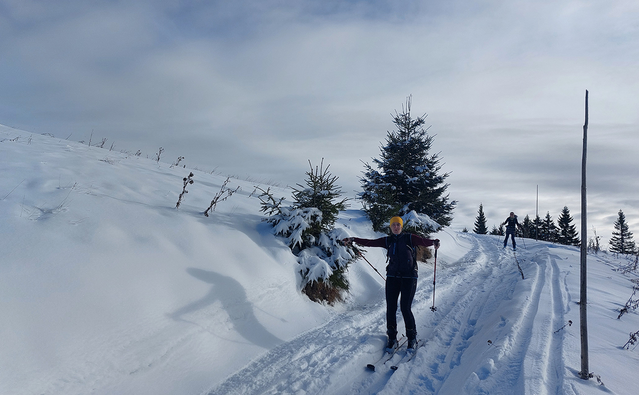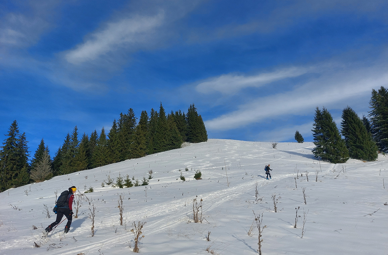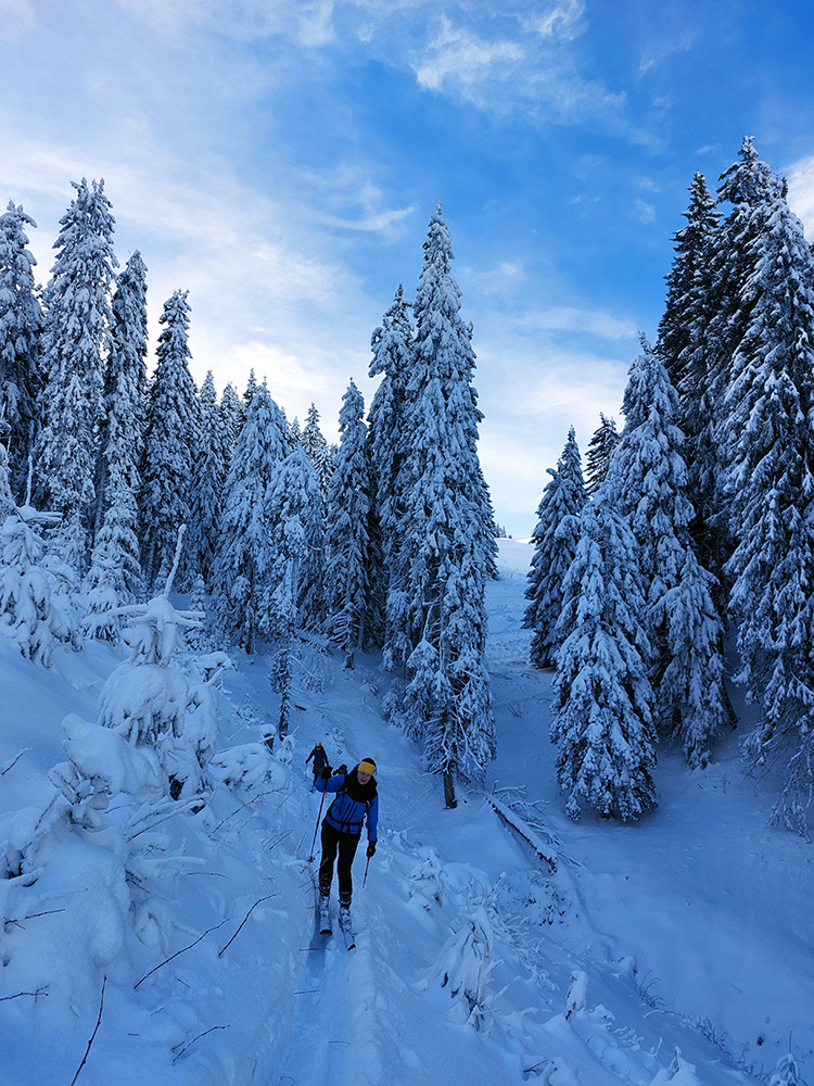 Podarilo sa zahájiť o týždeň skôr ako vlani, aj to je už úspech! A dalo by sa vlastne ešte o týždeň skôr, po prvom poriadnom snežení. Niekde, lebo veľké lokálne rozdiely ten navlnený snehovo-dažďový front priniesol po 20. novembri. Zámer bol ísť na Smrekovicu, lebo v dolinách snehu málo a ešte aj to zlízal lejak, nad lesom zúrila pri prechode frontu víchrica a vydrela všetko do ľadu. Zato Smrekovica a okolie presne v tej ideálnej medzivrstve, dokonca na severných svahoch sme nesmelo dúfali aj v nejaké lyžovateľné prášky na zmrznutom podklade. V Ružomberku snehu nula, ale v hlave ešte zneli správy, ako práve pred týždňom v Bielom Potoku asi ako prví na Slovensku spustili vlek – takže oproti cez dolinu, okolo Vlkolínca, musí byť snehu tiež toľko, že by sa aspoň hore brehom dalo... A aj tak bolo – v smere z mesta na juh snehu okolo cesty rapídne pribúdalo! Čiže zmena plánu, odbočka doprava skôr a reťaze ostali v kufri, lebo na parkovisko pod Vlkolíncom cesta odhrnutá, posypaná, aj keď s ostrovmi ľadu. Ale dalo sa. Takže začalo to romanticky:
