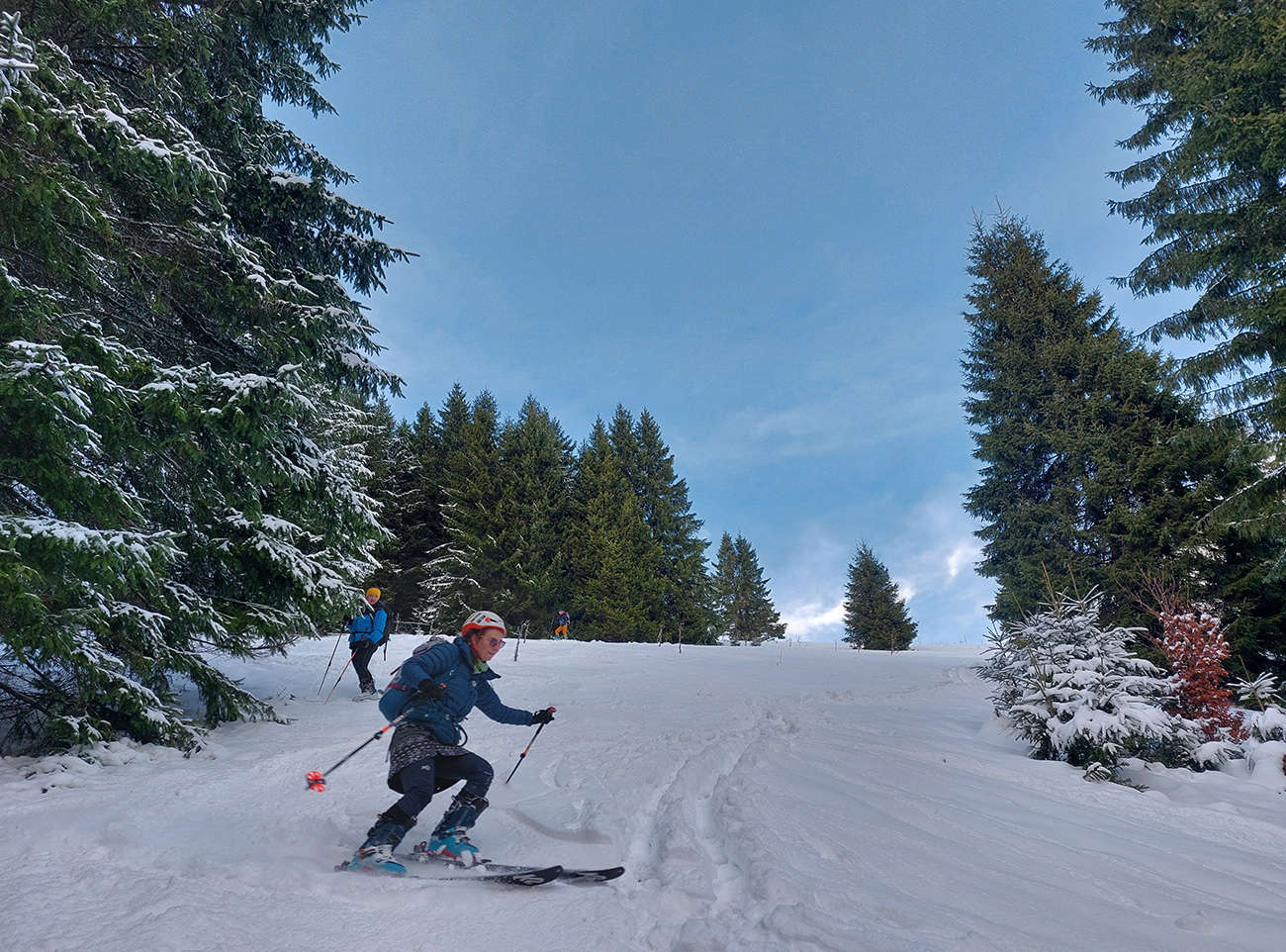 Hore Suchým Hrabovom snehu ako v polke zimy a tvrdý základ nadstavený 5-10 cenťákmi prášku. Na koniec novembra niečo nevídané! Aj keď vyššie, v traverze otočenom na juh a pod stromami bez listov už popŕchalo, ako sa slnko usilovalo. Aj pár vytopených miest pod pásmi, ale tu vyššie aj na zjazd totálny komfort.