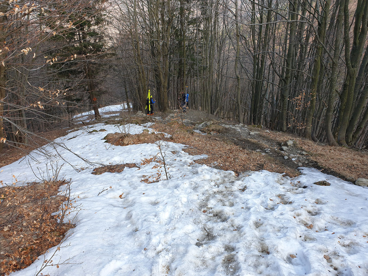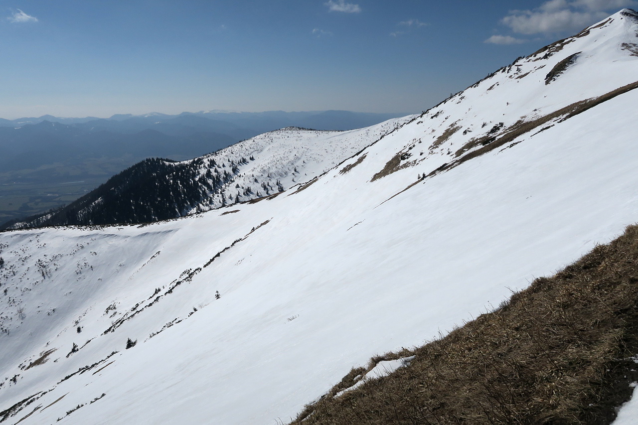 Asi 50 výškových od hrebienka sedla Kraviarske zapíname do lyží,ťaháme sa kus vľavo od smerovníka a takto pohodlne,síce s haršajzňami,lebo severy,si cupkáme v miernom ale celkom štipľavom vetríku na hlavný hrebeň do sedla Bublen a myslíme si,že takto budeme pokračovať až na Malý Kriváň.Na hrebeni prekvapenie,snehu niet a treba nosiť.Aj po trávičke aj po blate a skale.Pár úsekov ideme aj na pásoch,ale veľmi málo.Cestou obzeráme podmienky na nami zamýšľaných zjazdovkách,pričom prvá vedie z malého Kriváňa kúsok jeho južným chrbtom a potom zatáča v smere k svojmu väčšiemu bratovi.Druhá potom z jeho východného výbežku.Snehu je tam dostatok.Slniečko naberá na sile a miestami vyzliekame a naopak,v závislosti od toho,čo nám dovolí severný vetrík.