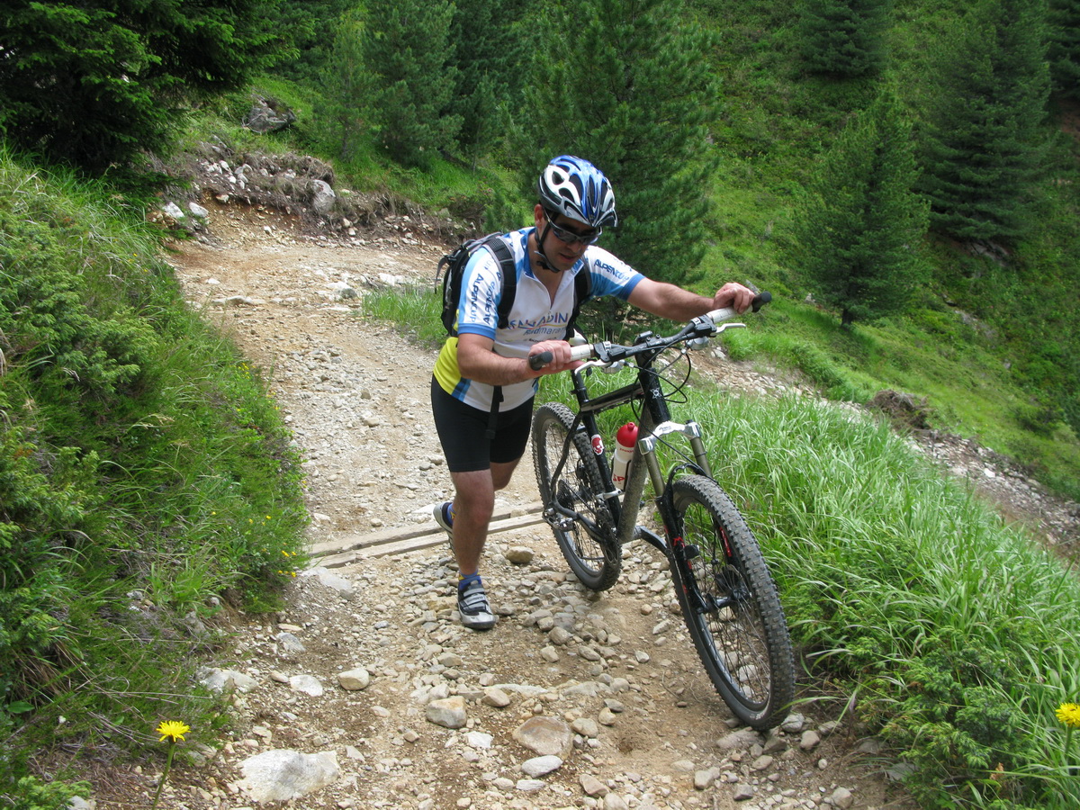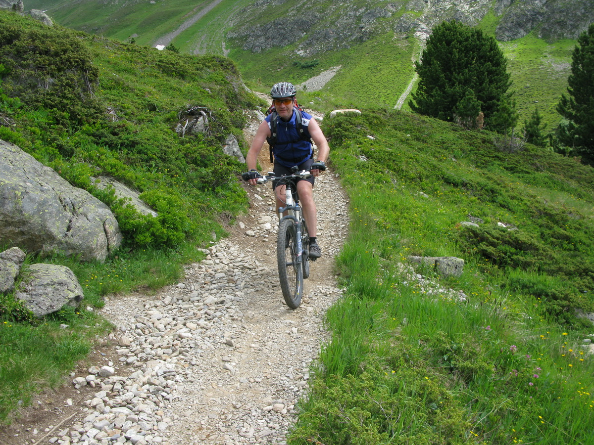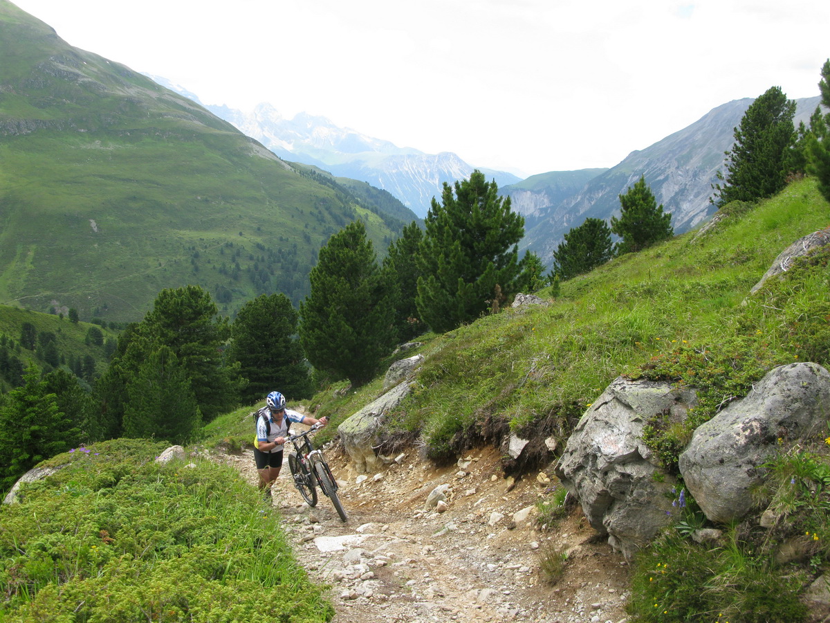 Val Susaunna však stála za to, výhľady nádherné. Zjazd už pokračoval štrkovou cestou, miestami však bola taká strmá, že v opačnom smere by bolo treba tlačiť...