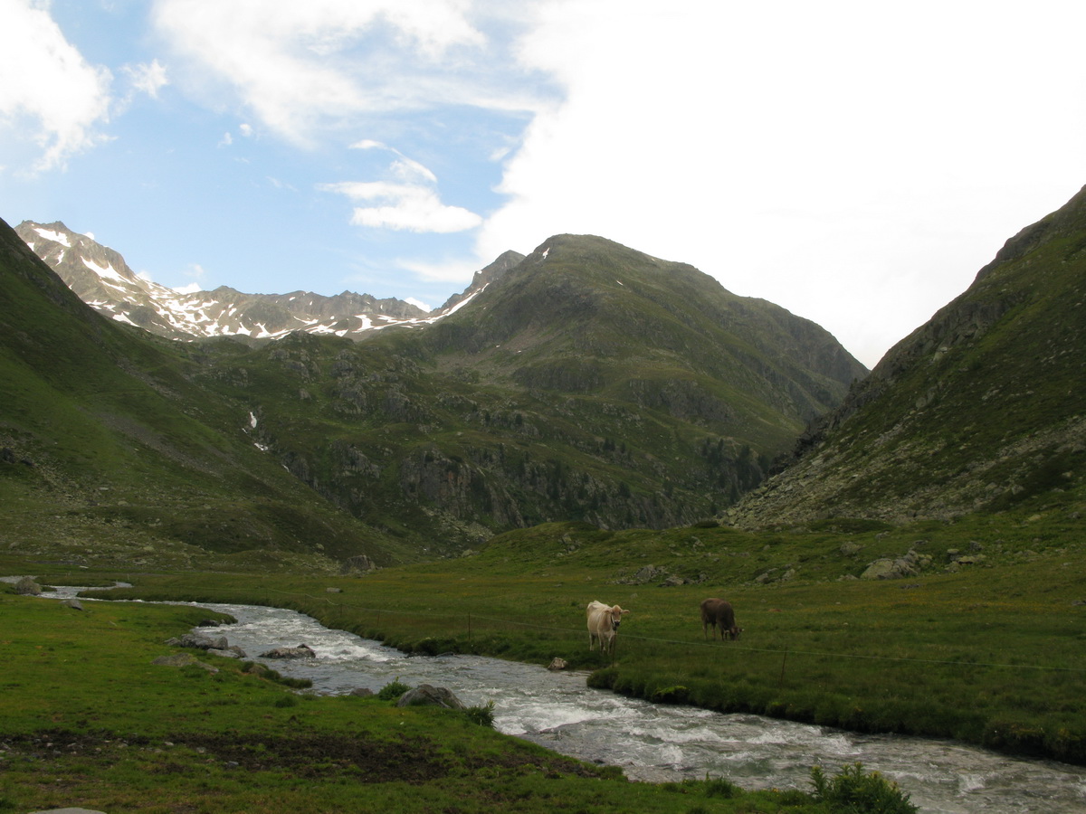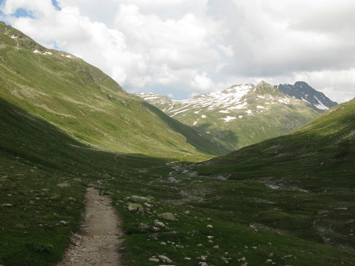 V Bergune sme sa zorientovali rýchlo, doplnili sme vodu vo fontánke a vo veľkej horúčave začíname stúpať. Najprv asfalt, potom štrková cestička a na záver parádny chodníček. Je vidieť, že to tu bolo upravené malým bagríkom a vznikol tak pohodový singlík. Zdá sa mi však trochu zbytočne široký... To pochopím až hore na chate, keď zbadám zásobovací chatový ratračik.