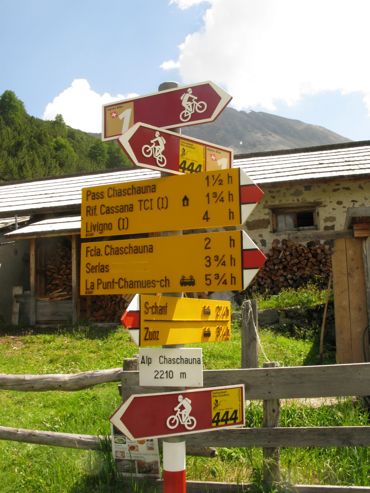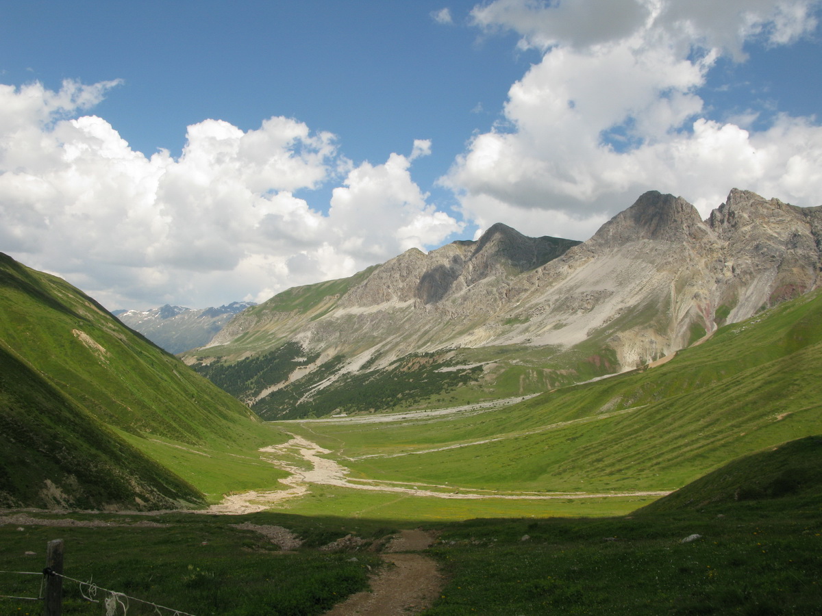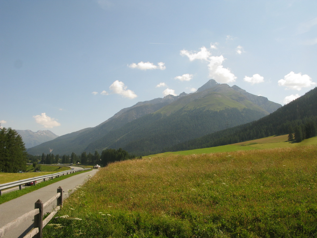 Zjazdujem dole Val Roseg. Ranné lúče už hrejú. Cez voľný deň v žiadnom prípade nehrozí skoré ranné vstávanie. Napájam sa na cyklotrasu, vedúcu údolím Engadin, a pohodlne sa po rovine približujem k môjmu cieľu: doline Chaschauna. Toto dlhé údolie, hraničiace so švajčiarskym národným parkom, by ma malo doviesť až na hrebeň, za ktorým sa už rozprestiera Talianske Livigno.