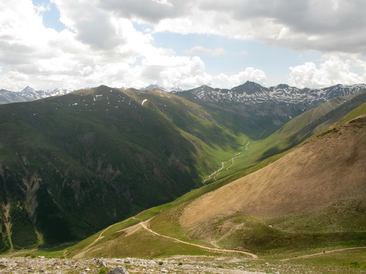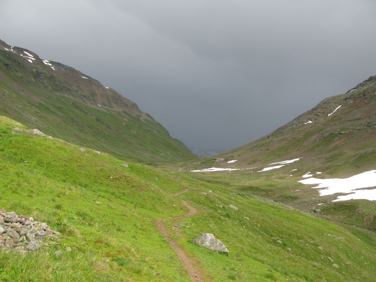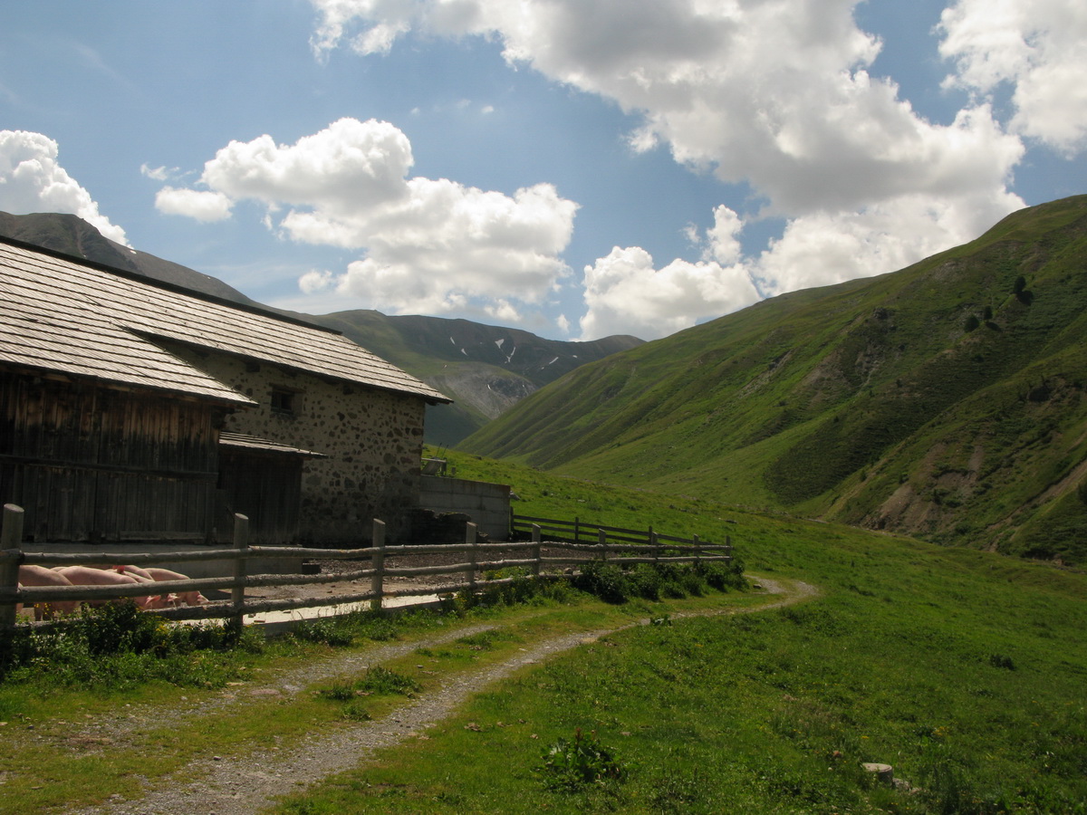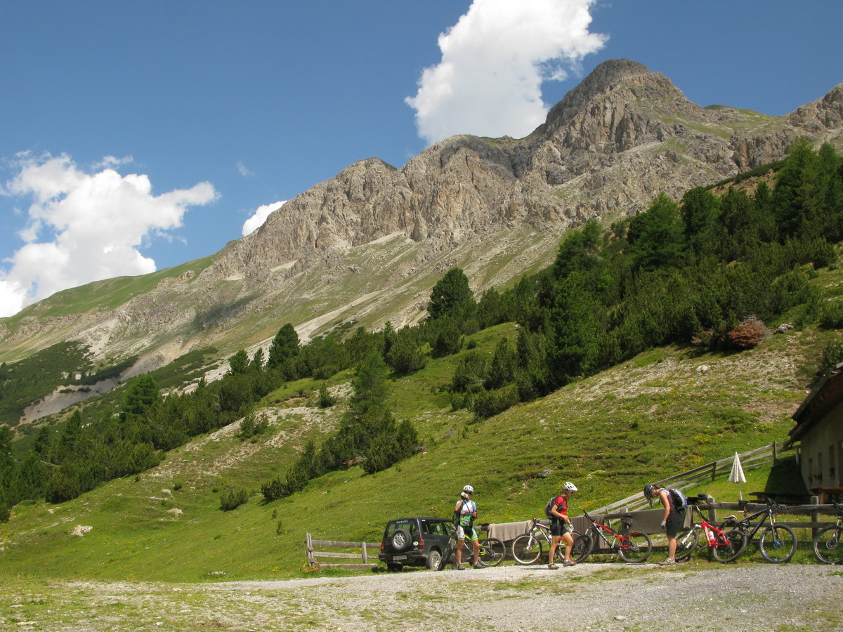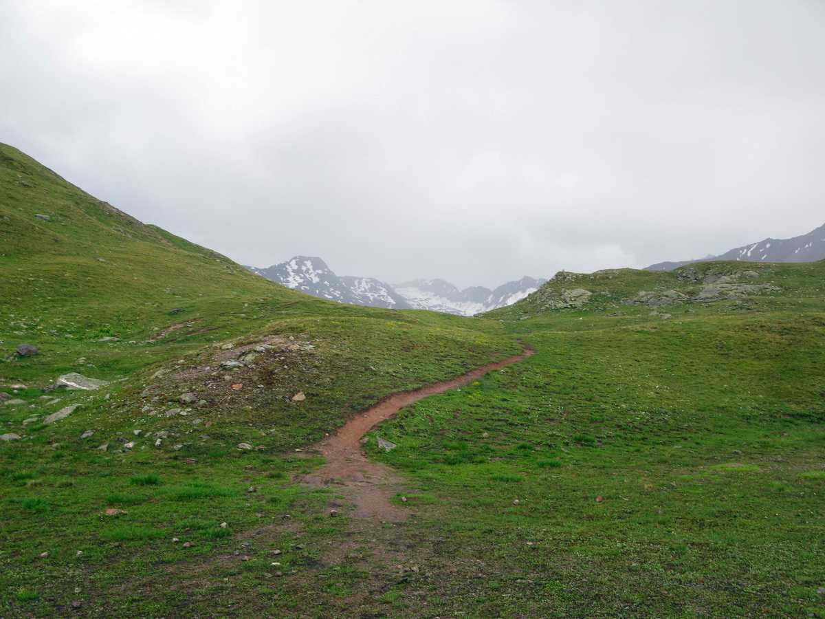 La Stretta, sedlo na hranici medzi Švajčiarskom a Talianskom. Aj o tomto mieste sa tu už písalo. Tentoraz musí ísť bajk miestami aj na chrbát. Prší a fúka vietor. Nevadí, som oblečený dobre. Vychutnávam si krásny deň. Zjazd dolinou Val da Fain je celý zjazdný. Klasický scenár: najprv pekný singltrail a od salaša štrková prístupová cesta.