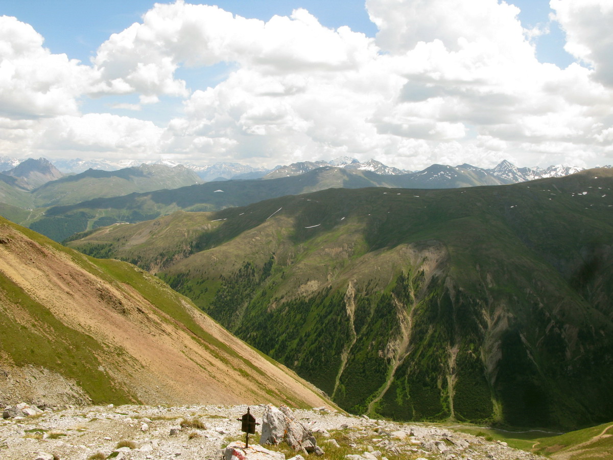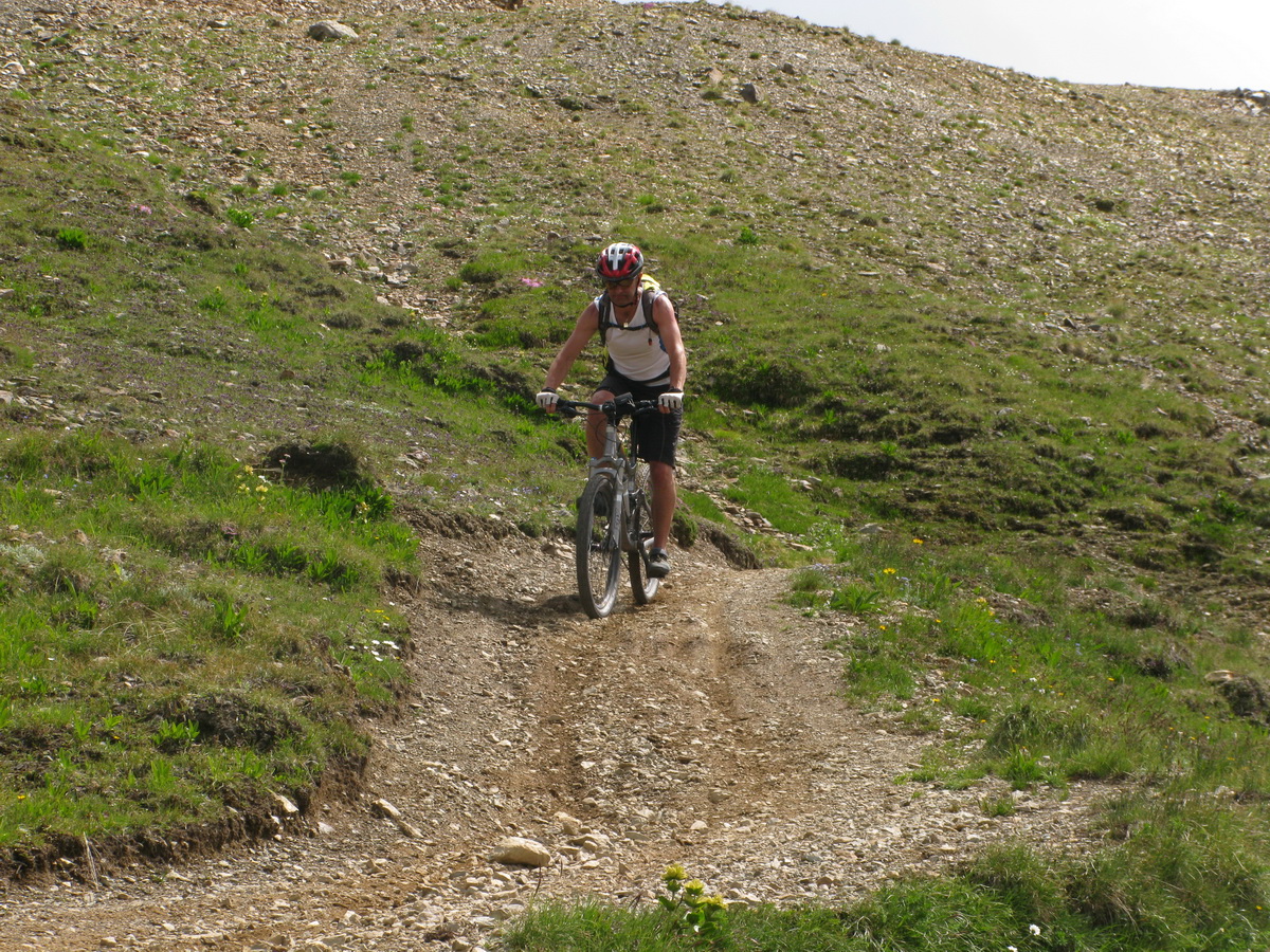 V sedle si dávam zaslúženú pauzu, vychutnávam si výhľady smerom na Livigno. Zjazd smerom do Livigna je zaujímavý len v hornom úseku po chatu Casana, odtiaľto už vedie strmá štrková prístupová cesta.