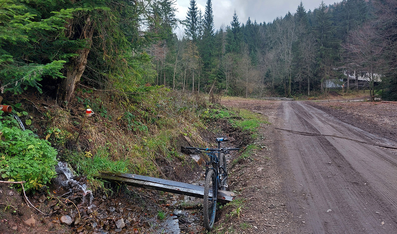 Na úvod dve malé odbočky hneď nad Štubňou. Prvá za výhľadom na ranný Turiec, ale hneď, ako som z cesty zišiel, lúka pod kolesami začala čvachtať. Potom ešte zachádzočka po lepšej ceste, že čo za hacienda sa na jej konci skrýva – a to len vodojem. Okej, tak nazad, popod lom a do lesa. Zatiaľ to bolo plnofarebné: