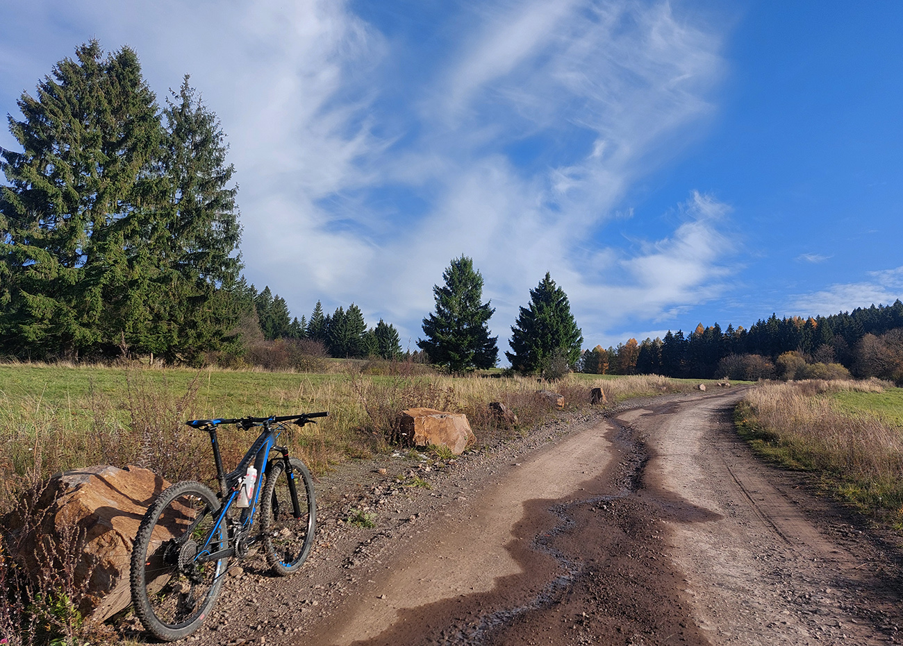 Až do konca to potom boli už len pevné cesty s dominanciou asfaltov, ale kadejakej hrboľatej kvality. Niekde až „bianche“, aký je tam asfalt od staroby vyblednutý. Takže bacha, aspoň gravel je tam treba. Ale ozajstné, pod kolesami praskajúce strade bianche sa aj tu našli. V podstate modrá a potom červená cyklotrasa až do Štubne, so skúpymi výhľadmi cez rúbaniská doľava – najskôr na vodárenskú nádrž, potom na kotlinu okolo Skleného a štubnianskej železničnej stanice. Taká pohodová cykloturistika.