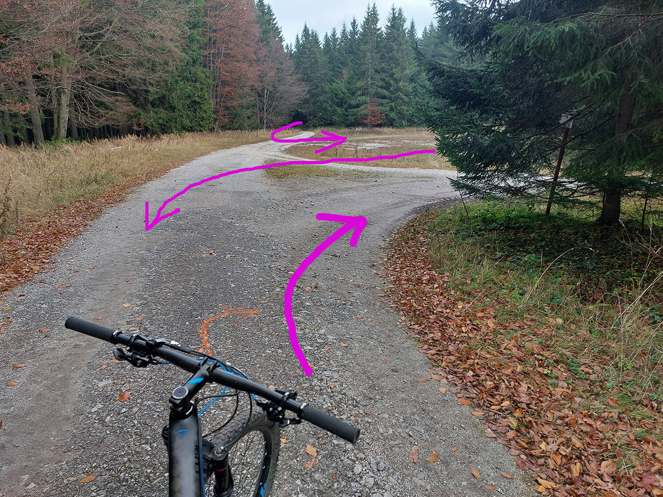 Tak nazad dole a z križovatky do ešte miernejších sklonov po príjemne praskajúcej šotoline, smer sedlo (alebo skôr križovatka) Široký peň. Cestou jedna poriadna zákruta, okolo prehľadné lesy a šírka aj pre kamión. Vynoril som sa na tej križovatke prvý raz, ešte dva razy som to mal v pláne, chystal som sa to tam poriadne zauzliť.