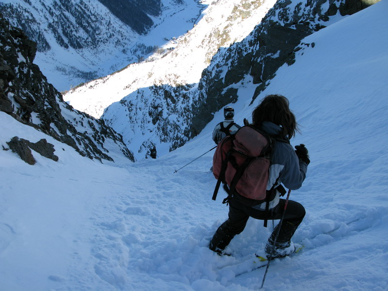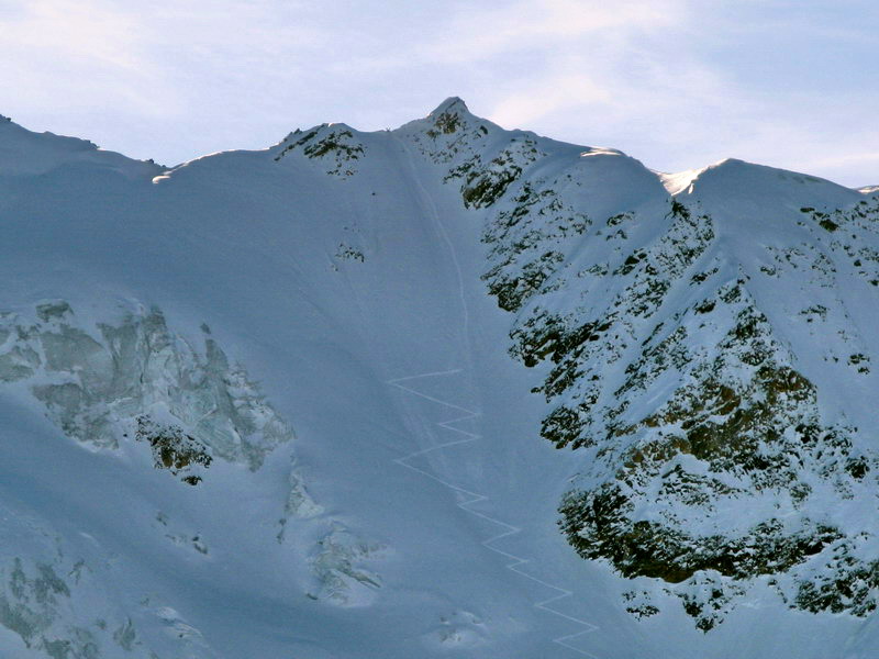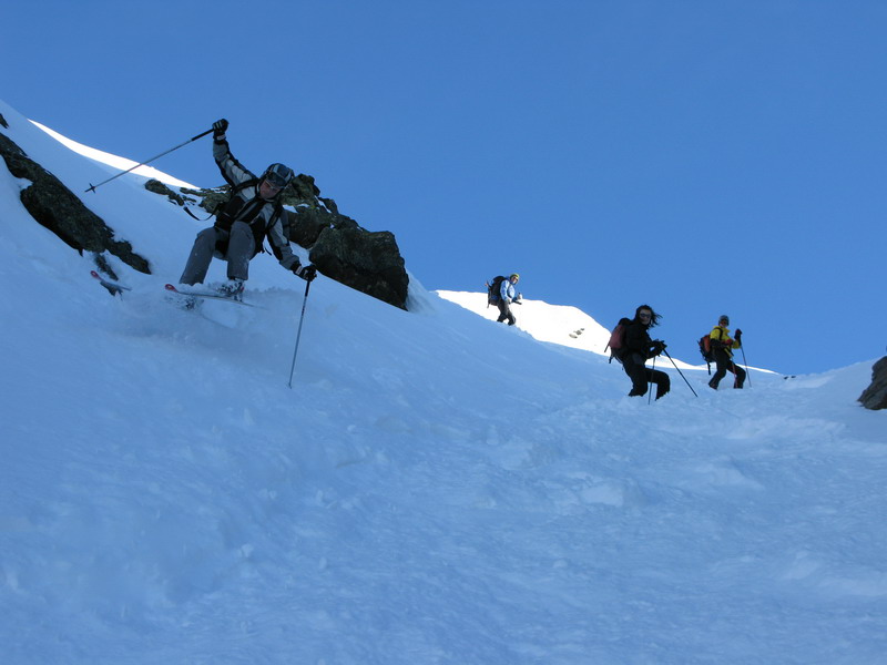 Počas traverzu sme odrazu zbadali v severej stene Schooterhornu veľkú čiernu škvrnu. Hneď sme zastali a začali sme žmúriť proti slnku. Spadla tam lavína, našťastie sme hneď našli dve pohybujúce sa bodky a tak sme v kľude pokračovali ďalej. Ypsilon nakoniec vôbec nebol taký hrozný ako som počul z rozprávania hostí. Dnes to bol nádherný žlab so sklonom do 45 stupňov. Vychutnajte si fotky.