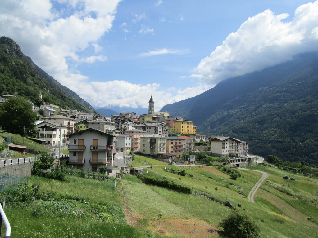 V sedle zamierim pohľad smer Cima Piazzi. Pofotím a zjazdujem do Val Grosiny. Tentoraz idem dole priamo dolinou. Veľmi dlhý zjazd. Šotolinu strieda asfalt. Je to taký zemepisný výlet, Otvárajú sa mi neustále nové výhľady a ja sa môžem obzerať len tak aby som zjazdoval čo najbezpečnejšie. Takmer 1800 výškových metrov zjazdu zakončujem v Grosiu. Krásne starobylé mesto tentoraz moc neobdivujem. Ľudia sa tu prechádzajú v rúškach... väčšinou... a ja nemám moc času kochať sa pamiatkami.