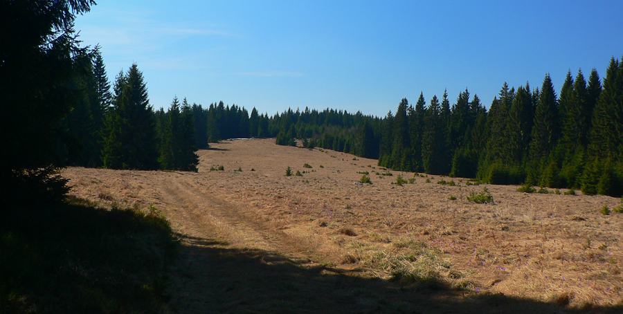 Mierime pod Ľubietovský Vepor. Miestami sa vpredu ukáže jeho Hrb. Zvážnica o chvíľu preskočí na druhú stranu hrebeňa a zmení sa na zaprasený chodník, behať sa tu nedá. Až posledný úsek nás vypľúva na šafránom sfialovené lúky, jedna má pekný názov Žliabky.