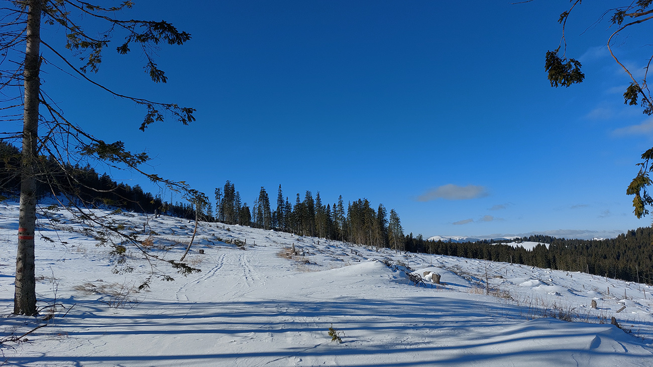 Od Martalúzky k neznačenému traverzu (ktorý som smerom hore neznalo obišiel) už je stopa poriadne načatá pešiakmi, ale lyže z jamy sa mi vyniesť darí, moc sa neborím. A aj keď treba miestami trochu postromčekovať alebo potlačiť rukami, dá sa. Pásy lepím až v tých rúbaniach s výhľadom ku Kojšovke, potom ale nasleduje poriadne kľučkovanie a podliezanie vývratiskom. Miestami ani podliezť, ani obísť. Ale sranda, snehu zatiaľ jesto – len dokedy vydrží? Je to tu na juhovýchodnom svahu dosť otvorené.
