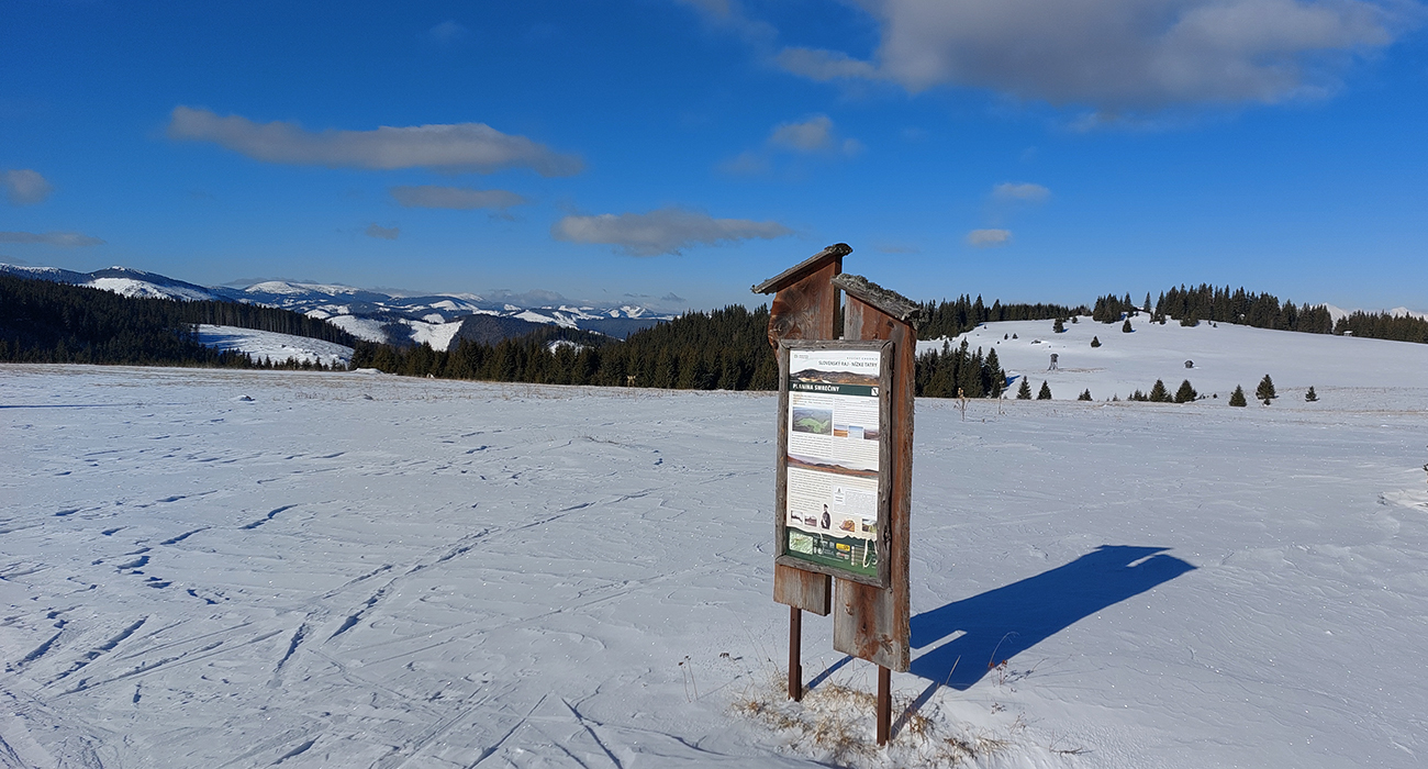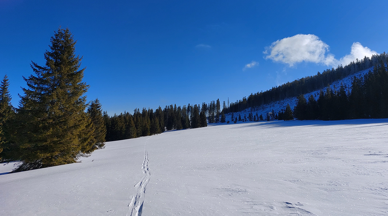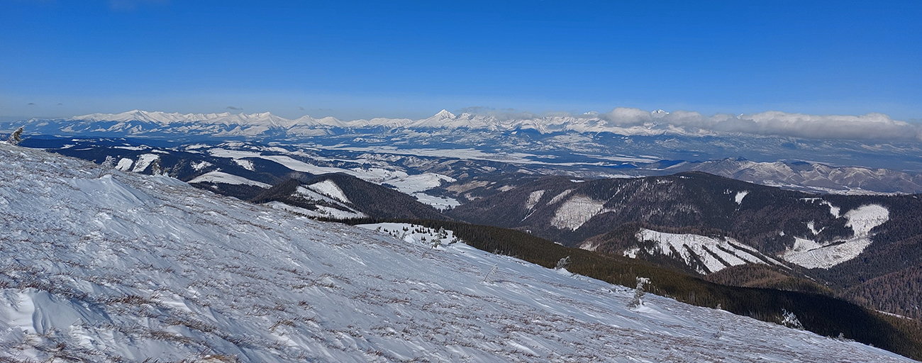 Po rozľahlých lúkach pred Smrečinským sedlom si ťahám za sebou čerstvú lajnu, len máličko sa prepadávam, kôrka je hrubá. Výhľady sa rozširujú aj na západ, niekam ku hrebeňu nízkotatranskému a možno až ku Fatrám? Vľavo vpredu nad tmavozelený les znovu vykukuje môj žiarivo biely cieľ. A už som znovu von na slnku, preč z mrazivého tieňa, vrhaného Prednou hoľou.