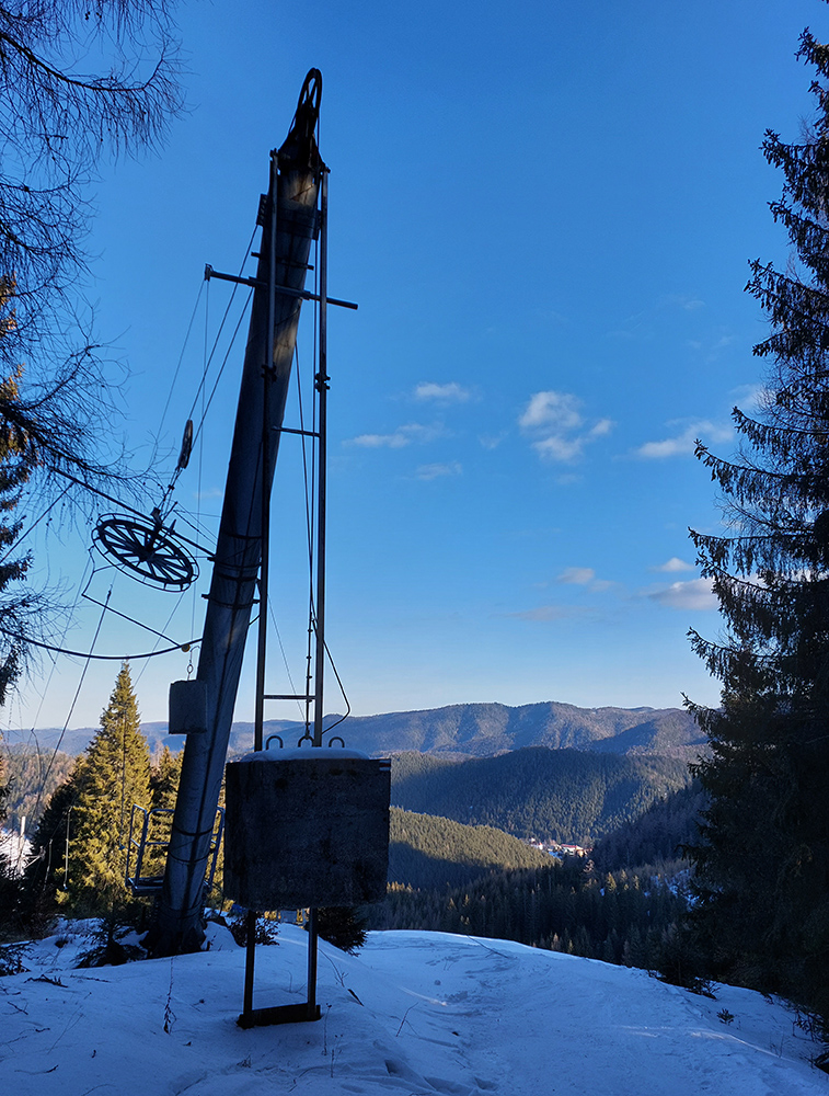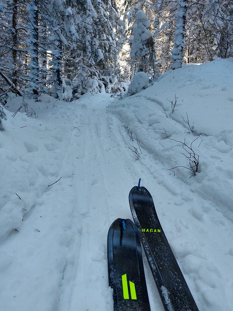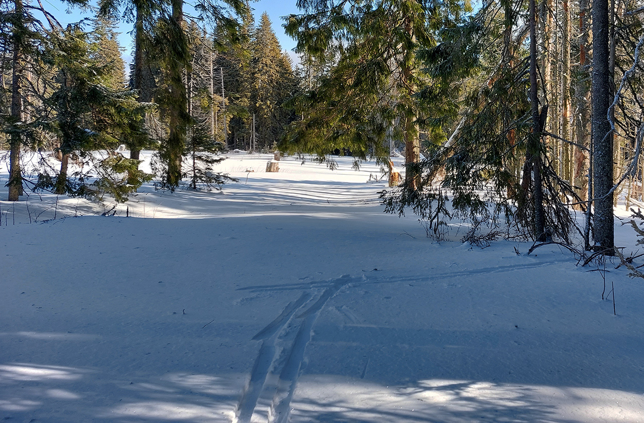 Našťastie až ku vlekom po ceste nemusím: malý mostík cez potok ku studničke a od nej už sa dá pomedzi krtince a trávu aj na pásoch, dokonca aj stopa je! Podklad: aprílový firn, hlboko zmrazený do tenkej kôrky na vrchu a sypkej plnky s bylinnou prímesou pod ňou. Dnes (sobota 12.2.) aspoň že teplota nemá vyliezť nad nulu, tak dúfam, že sem aj zlyžujem. Pod vlekmi ľadový menčester, v prudších pasážach zjazdovky musím poriadne potiahnuť rukami. Vstup do lesa: stopa široká, vyleštená brzdením, ale špinavá od konárikov a šišiek, občas hlinu vidno. Ešte sa pýtam vlekára, či prejdem bez vyzúvania. Nevie.